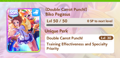 This is a pretty standard and reliable deck to shoot for for a Sprinter.Card choice is also important. The ubiquitous Kitasan Black is going to always be valuable in just about any deck as a primary Speed card, and in a deck with four Speed cards, we certainly want to include it if possible. Kitasan Black brings a lot of valuable tools to our training kit, including Mood alternating events, energy recovery, and also a bonus to Power training at high enough levels. If you have access to them, some other great SSRs for Sprinters are Biko Pegasus and Special Week “The Setting Sun and Rising Stars” from the launch event. These would certainly be “luxury” picks due to the fact that SSR cards, especially those with multiple Limit Breaks or MLB, is going to be far less common than maxed SR or R cards.