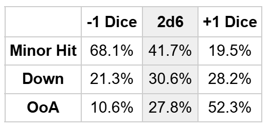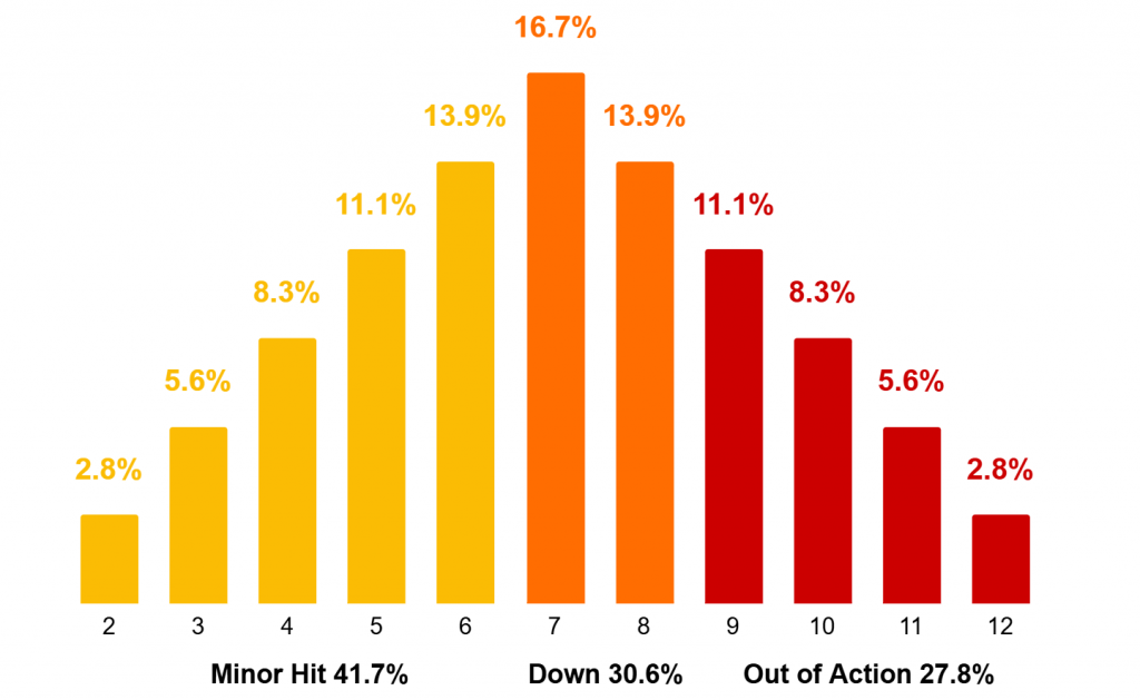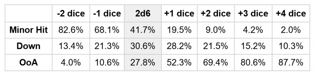A flat 2d6 injury roll is most likely going to result in a Blood marker, so when you’re really committed to taking something out of the fight you’re going to want to be modifying the roll. So let’s look at +1/-1 again, remembering that Blood markers are spent to give +1 Dice on this table, so we’re looking at this the other way around from the action roll.