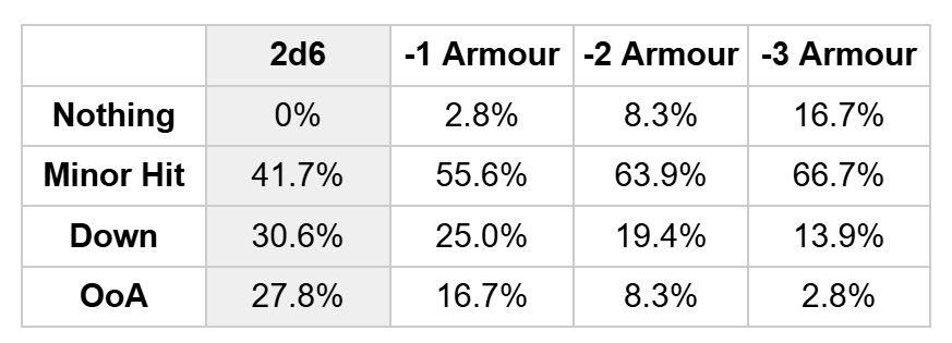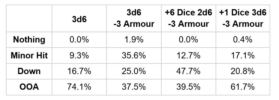 Success for D6 Brains - Flat Injury Rolls on -3 Armour: 1: Nothing 2 - 5: Minor Hit 6+: Down 6+ on a 6+: OOA