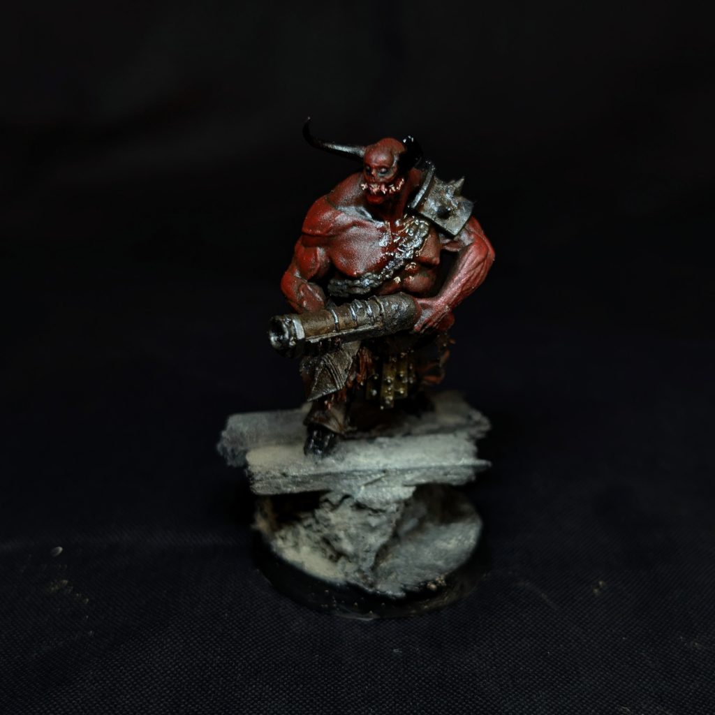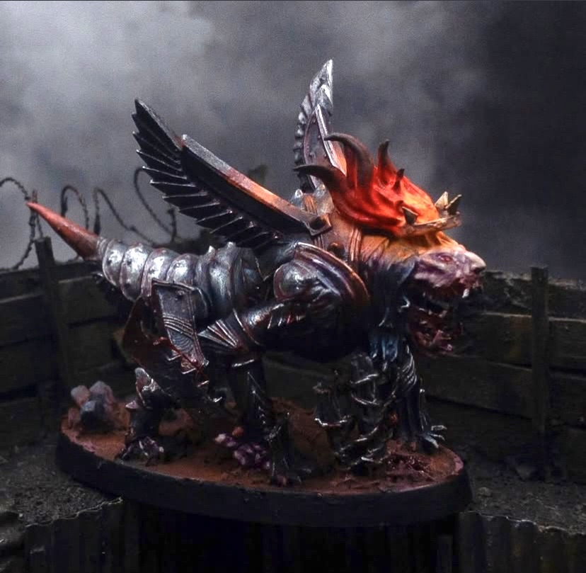 Credit: Josh Tedd (@thepaintingtedd)Yoke Fiends are Demonic and Bestial Hybrids, grafted by the Priests of Hell. Coated in muscle and a mish-mash of animal features and traits, depending on how they were constructed. Despite their means of creation, they are formidable on the field, standing well above the meagre humans the faithful sacrifice to the Great War.