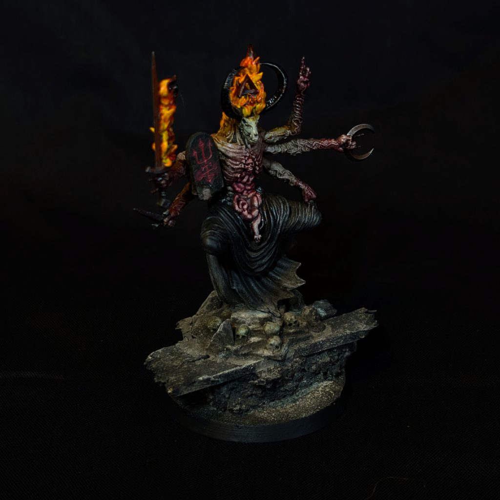Credit: Darius_minisA demonic commander bound in service to a demon lord or archdevil. They command warbands in their master’s service, fulfilling whatever task is bestowed upon them, whether that be fighting on the Frontlines of the Great War or participating in the many battles within the very realms of Hell itself, for the power dynamics of Hell are ever-shifting. Despite their prowess and status in the Great War, within damnation, they are seen as barely above even the mongrel Yoke Fiends; their mortal blood, however small, taints the demonic purity. The disgust they inspire in their patron is only just outweighed by their usefulness, as their mortal aspect allows them to walk upon His land.