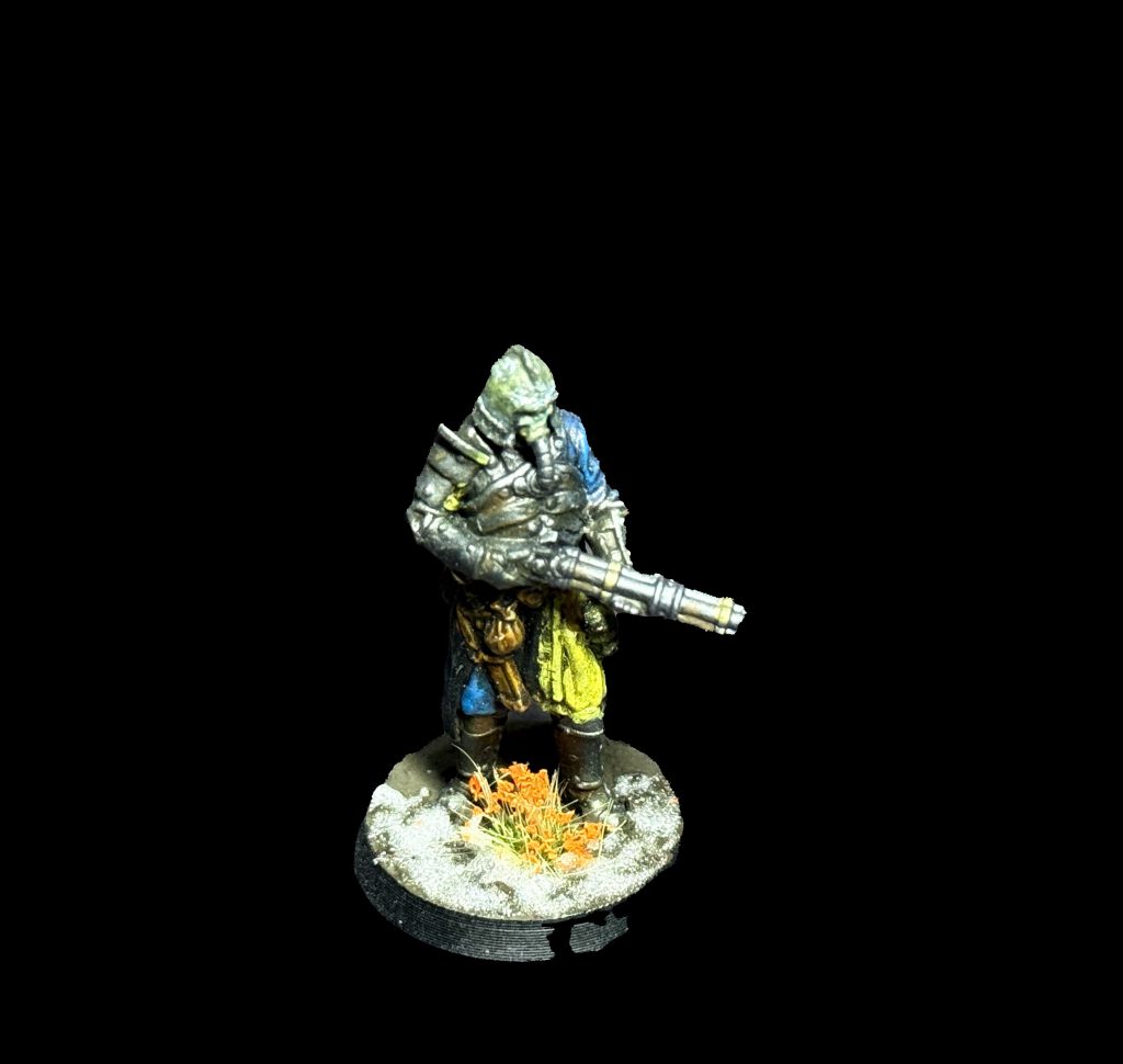 Manno Benedetti. Image: BeezerFor the remainder of my allotted Ducats, I decided to invest in some Yeomen, the basic foot-slogging troops of New Antioch. For these models I chose the Bane Gunners from Bestiarum Miniatures. The skull masks and overall aesthetic hit all of the right notes for me. Until I can afford some Shock Troopers, I needed these guys to be able to get up close and personal with the enemy and engage them after taking long-range fire from my Sniper Priest and Heavy Infantry. I also decided these would be the two fireteams I’m allowed to have in my Warband. In my head, they would support each other as they closed with the enemy. I equipped two of them with Shotguns (and yes, I will say “this is my boomstick” every time they shoot), trench shields, and swords. The other two I equipped with swords and grenades. Appropriate equipment for close range engagements in my humble opinion. Is it effective? Jury’s still out on that. Is it cool? Yes. Yes, it is. Which in Trench Crusade is what really matters if you ask me.