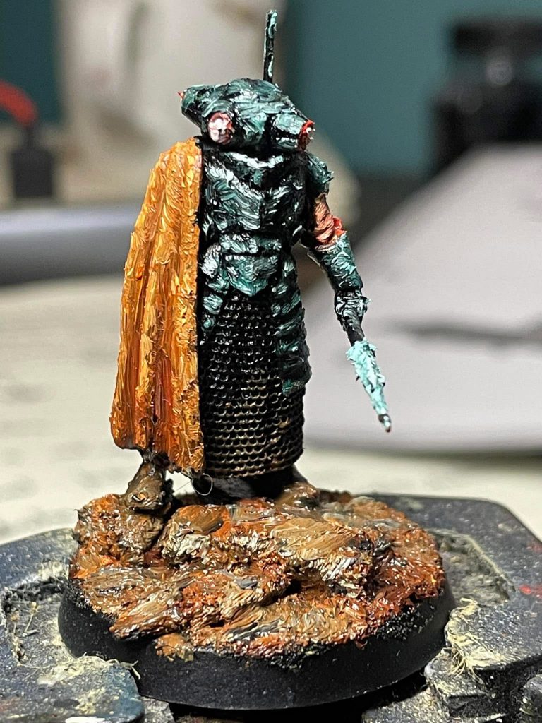 Trench Crusade Observer. Credit: lenoonI felt pretty proud of this and stuck it on the Trench Crusade facebook page. I did not expect the reactions - incredibly polarised! It ended up about 50:50 between "I absolutely fucking hate this" and "I love it". Something about breaking the boundaries of what we're supposed to do with models seemed to flip a switch for people, either into abject hate or fairly effusive praise. My key learning from these test models was that going maximalist thick over the whole model wouldn't work - the Observer's chain mail is just a black wash over gunmetal. I took that forward into the Sultanate scheme, where flat metal or acrylic painted skin helps to break up the chaos.