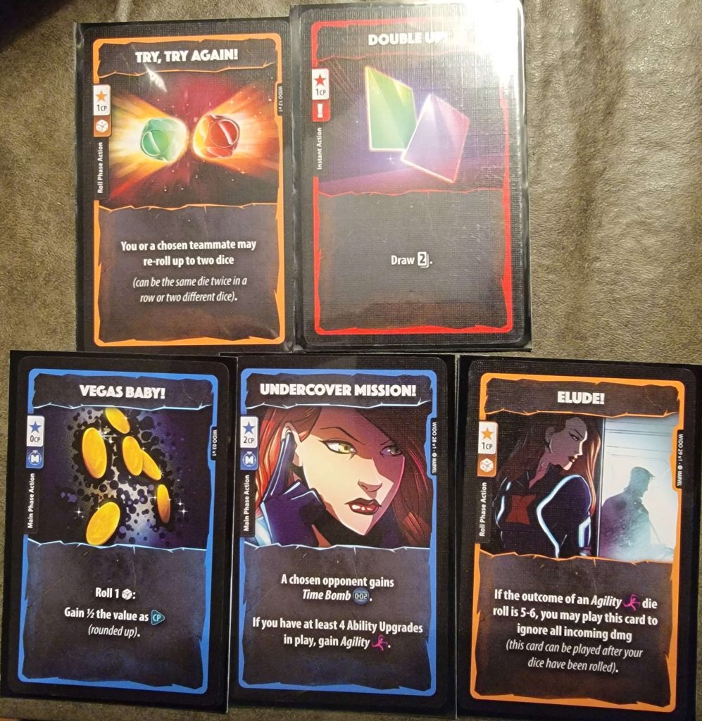 Black Widow Cards SampleThere are two types of cards in each deck: Hero Upgrade cards and Action cards. Some Action Cards can be played outside of one of your Main Phases and can do things like adjusting the value of a die, earning you CP, or removing effects. These can have dramatic effects, especially when they can manipulate your opponent's amazing dice rolls!