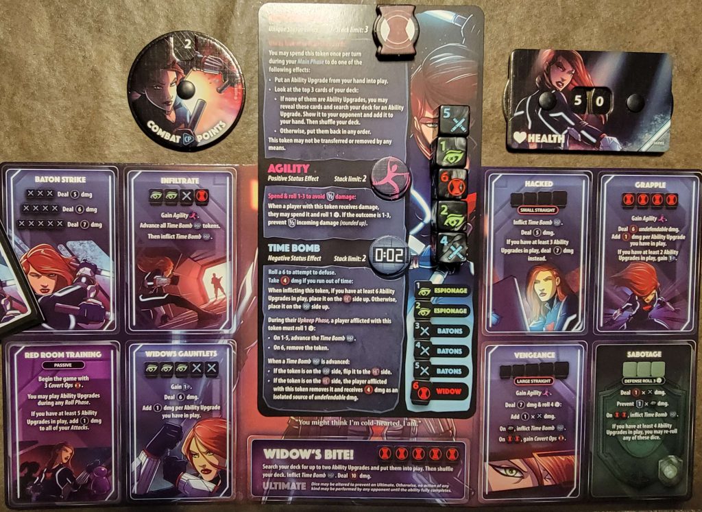 Black Widow SetupMarvel Dice Throne by Roxley Games is a very thematic game of rolling dice, playing upgrade cards, and attempting to pummel your opponent into the ground. It has rules for 2 to 6 players, though I have only ever played it as a 2-player game. Most games should take about 30 minutes, so it can be a quick filler game, or you can play multiple times in a single sit down.