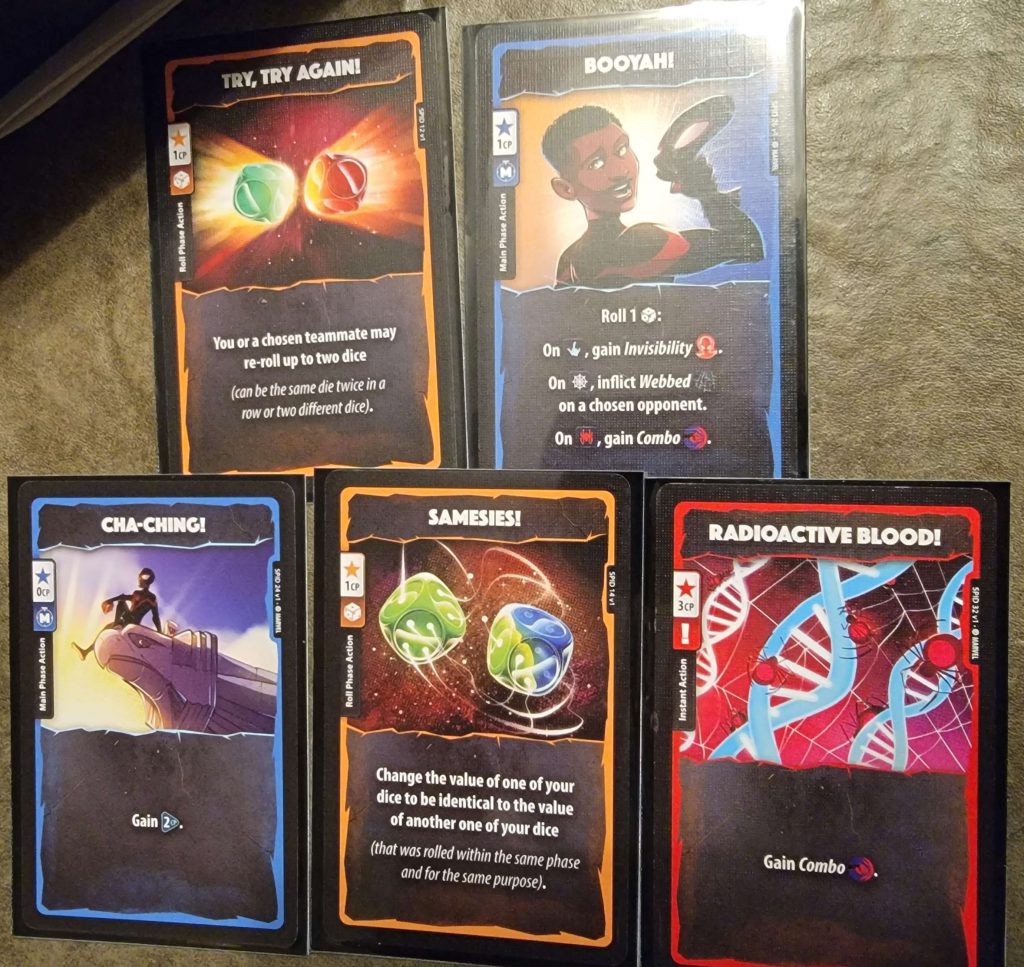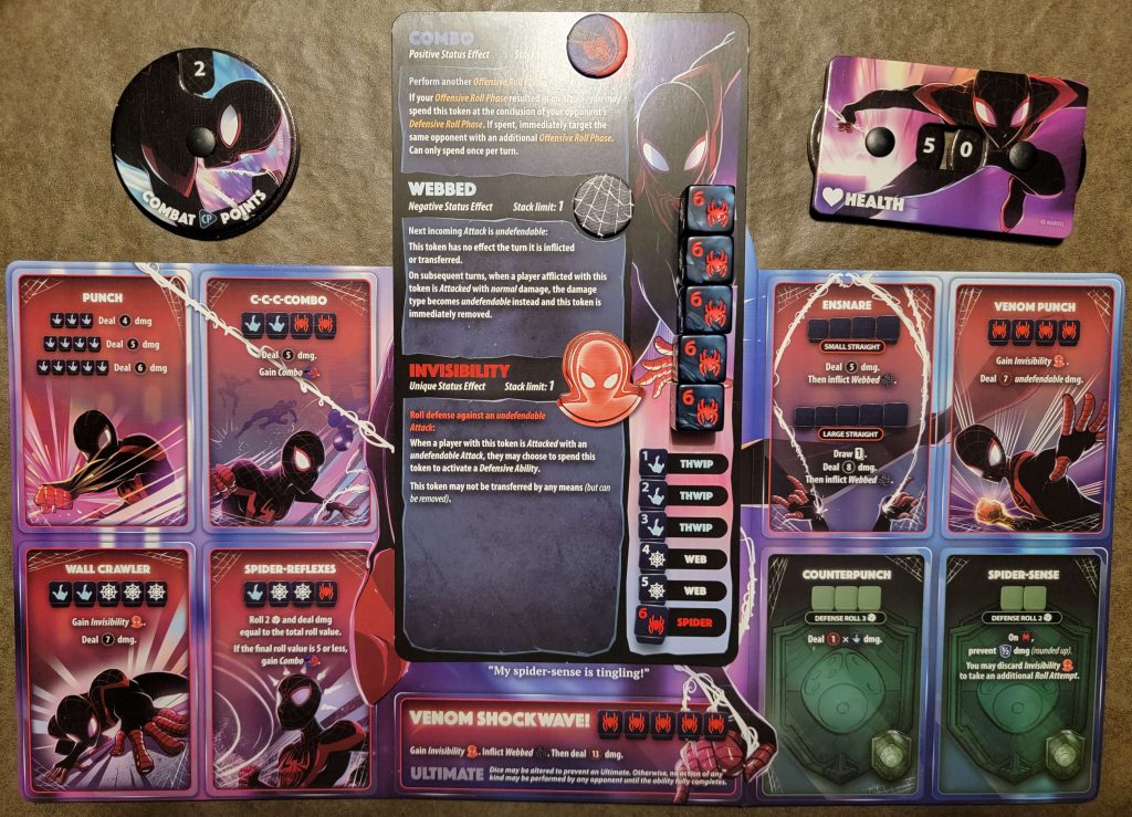 Spiderman SetupThe setup is quick and easy, and the gameplay is very simple to learn. A player’s turn consists of several phases: Upkeep, Income, Main 1, Combat, Main 2, & Discard. To anyone who has played any TCG, or LCG, this will all seem very familiar. If you haven’t though, there are helper cards in each character pack to remind you. In the Upkeep Phase, certain effects may trigger (like bombs placed on you by Black Widow). The Income Phase is where you will draw a card from your deck into your hand and gain 1 CP (Combat Point). Main 1 is where you can spend CP to play cards from your hand, as is Main 2 after combat. The Combat Phase is where most of the action happens! In it you will roll your 5-custom dice, rerolling any you like up to twice (much like Yahtzee) in an attempt to get certain combinations to power your attacks. Once you have settled on which attack you will activate off your Hero Board, you declare the results to your target. They then have an opportunity to roll a single Defensive roll (unless your attack is of “Undefendable”, “Pure”, “Collateral”, or “Ultimate” damage), and apply its effects, if any. Lastly there is the Discard Phase where you can discard cards to gain CP and must do so if you have more than 6 in your hand. Play alternates around the table until only 1 Hero is left standing.