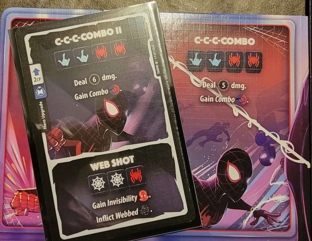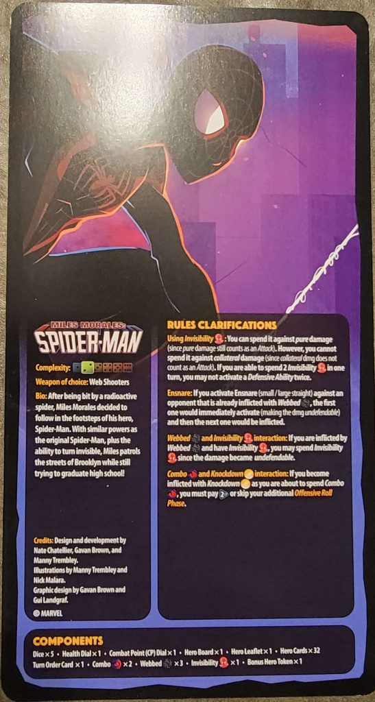 Spiderman's UpgradeEach Character packet includes a Hero Leaflet which explains any special rules for that Hero, what faces each of your dice have, any rules clarifications, a list of components in the packet, and my favorite detail: the Complexity rating for that Hero. This feature is so very helpful in that it lets you know immediately if that Hero is going to be right for a new player or not. I honestly wish more games included such a consideration.