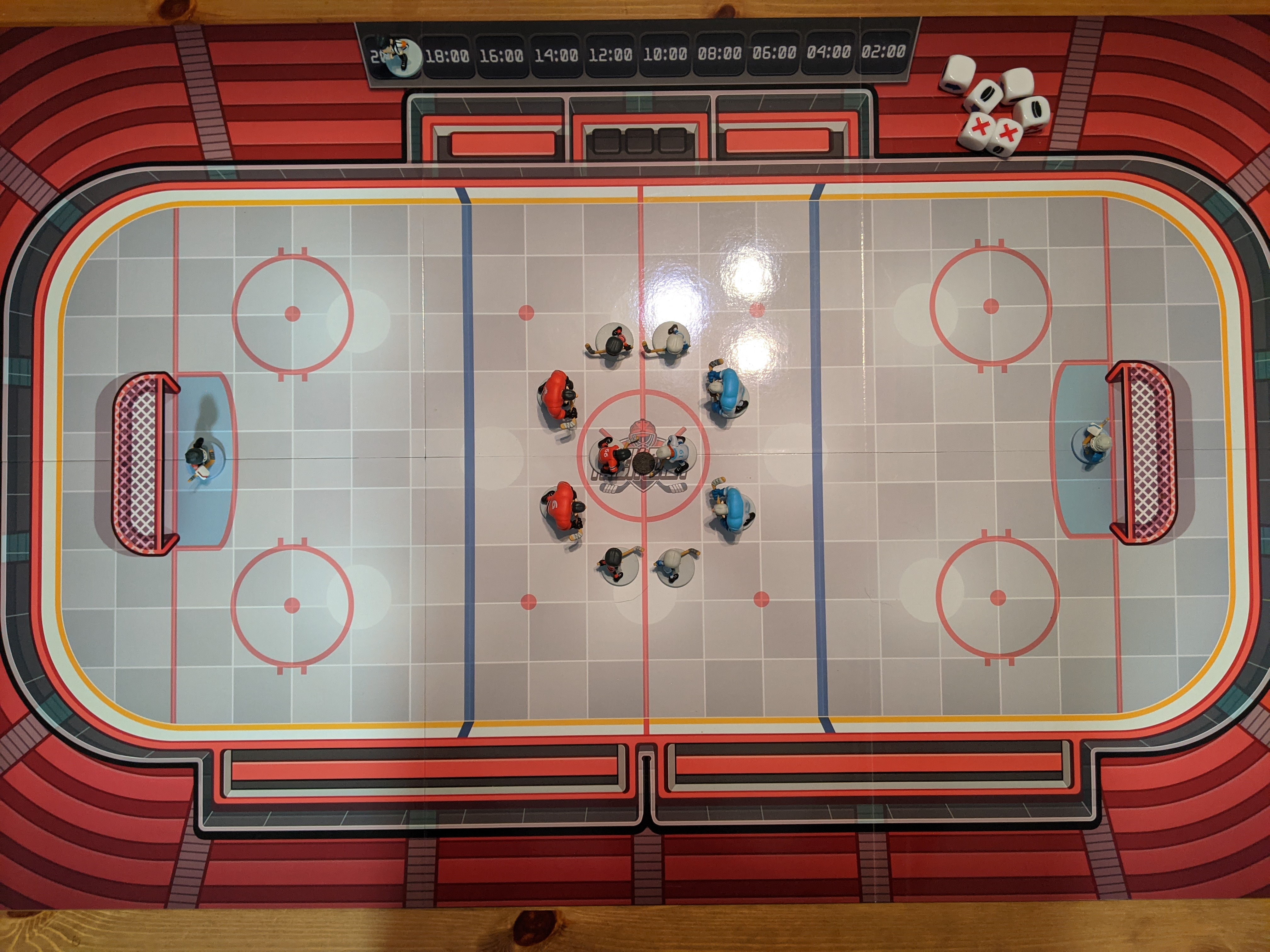 Blue team on offense.This creates some really tense moments as you push your luck against the dice, hoping you’ll roll enough blank results to make re-rolling into success reasonably possible, watching as your team slowly tires out and becomes less and less effective. It also does an OK job of simulating the flow of an actual hockey game, forcing you to look for situations where handing off the initiative won’t be completely disastrous so you can switch to a fresh line. It also means that a team pulling a long shift is less reliable than one with a fresh line, and rewards teams who regularly rotate through their roster with much more reliable turns. At the same time, when you find yourself in need of some late game heroics, one of your players stepping up in the clutch is always possible, however unlikely.