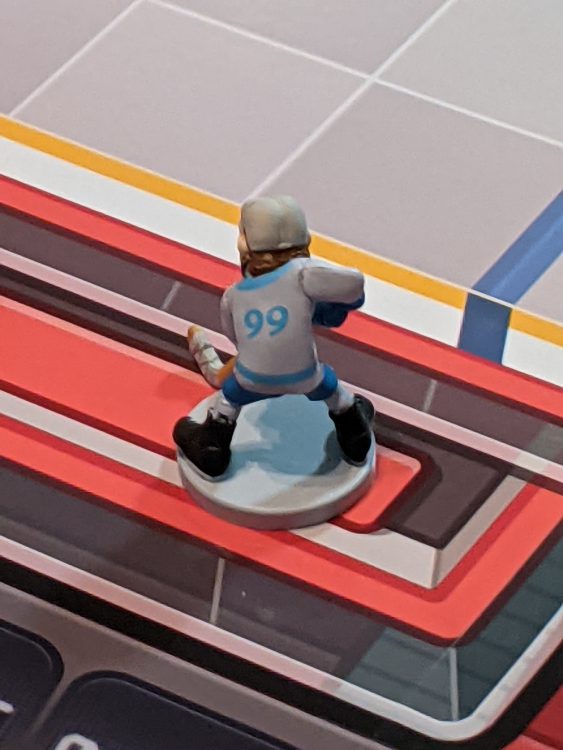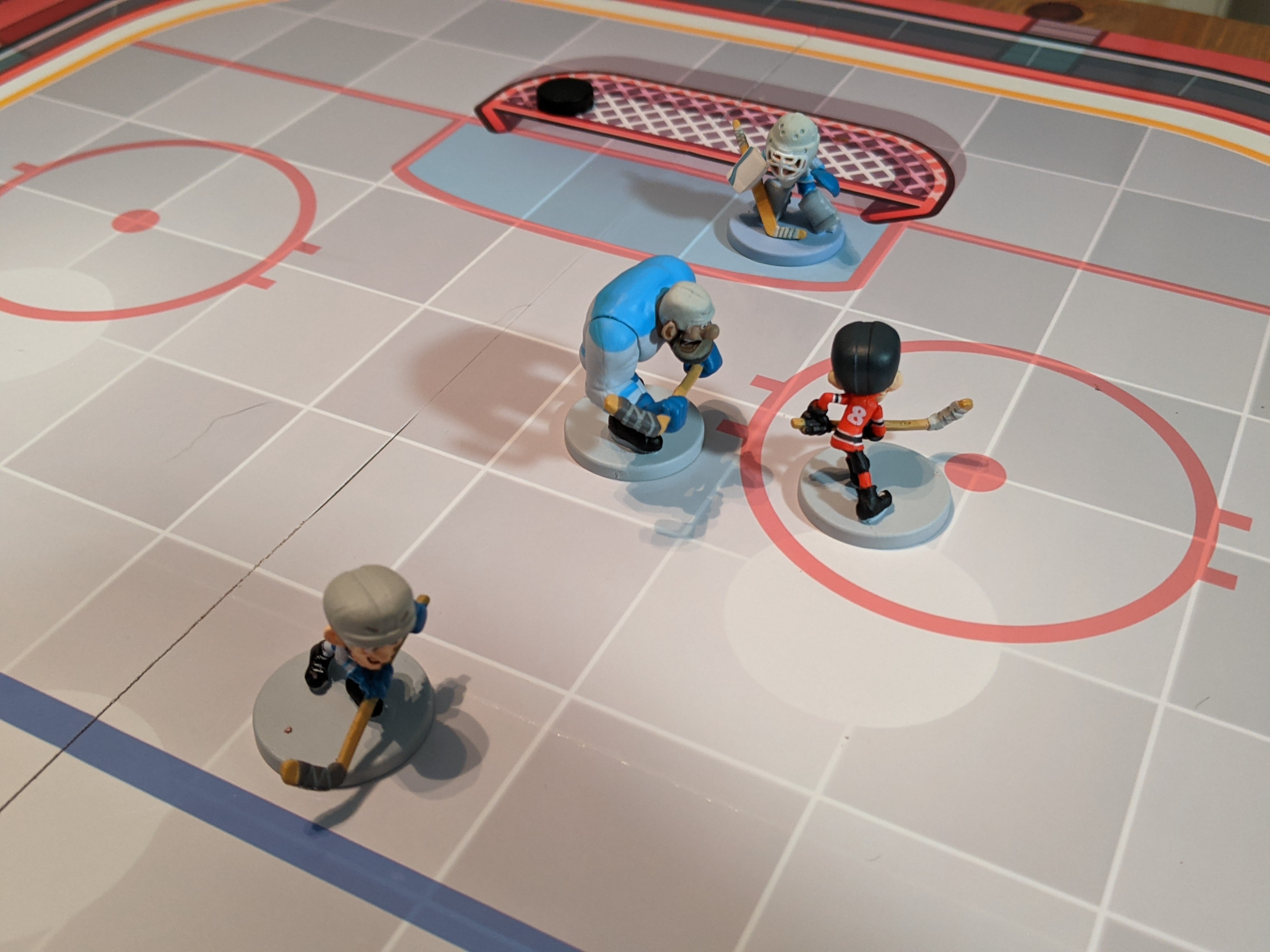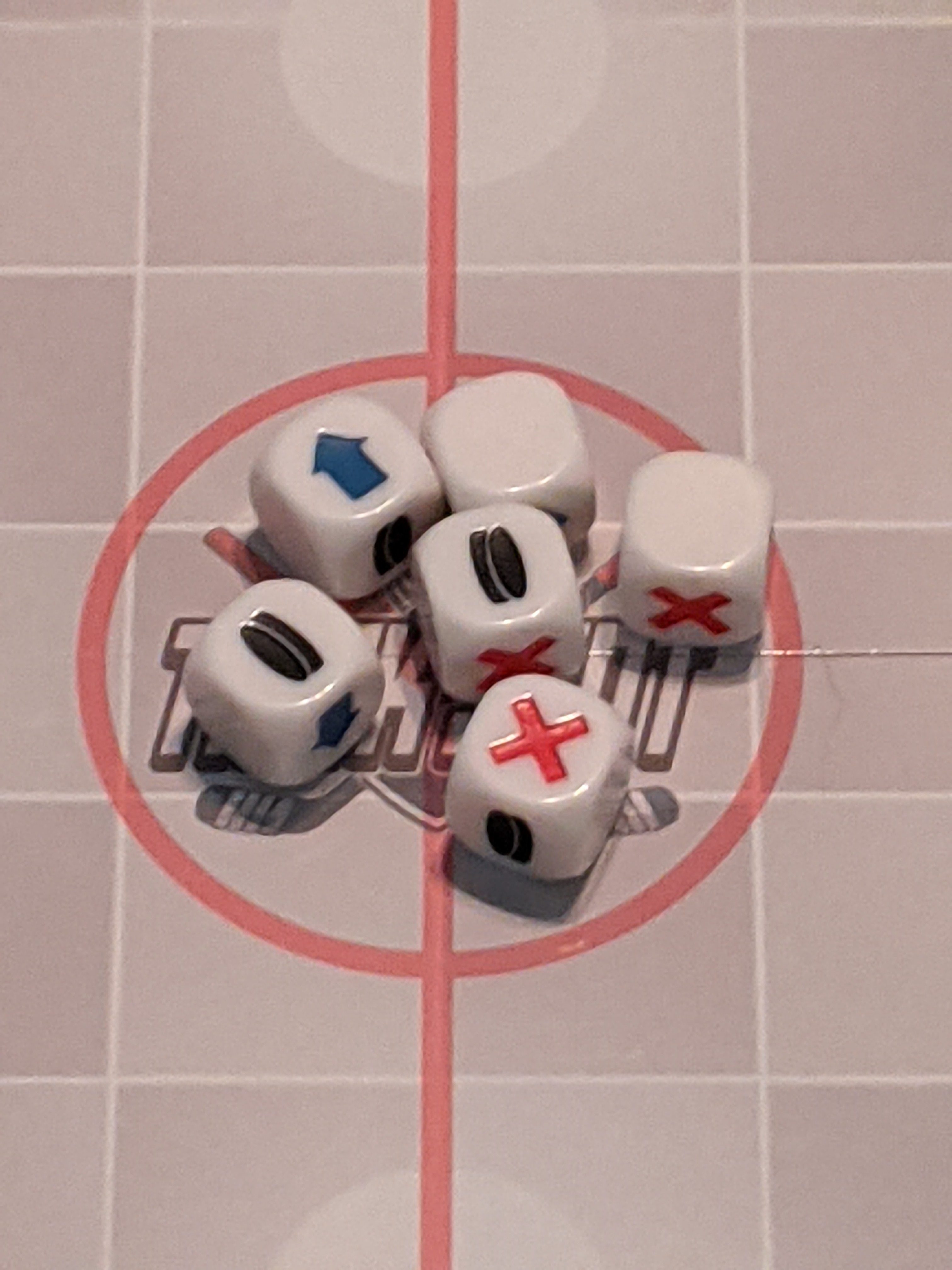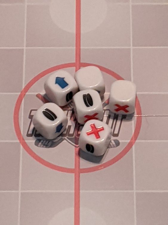 Game Misconduct: Ten minutes for blasphemy.The dice-based nature of the game means it can be pretty swingy. Quick goals aren’t uncommon – due to the geometry of the initial setup, scoring within 5 activations of the face-off is possible with a little luck. It’s pretty unlikely – you’re more likely than not going to roll at least one X or reaction starting on your 3rd roll, not counting re-rolls – but I’ve seen it happen in multiple games. That can be a little demoralizing, but quick goals are a part of hockey, and having the opportunity for heroics honestly feels right (despite how much I hated when it happened to me).