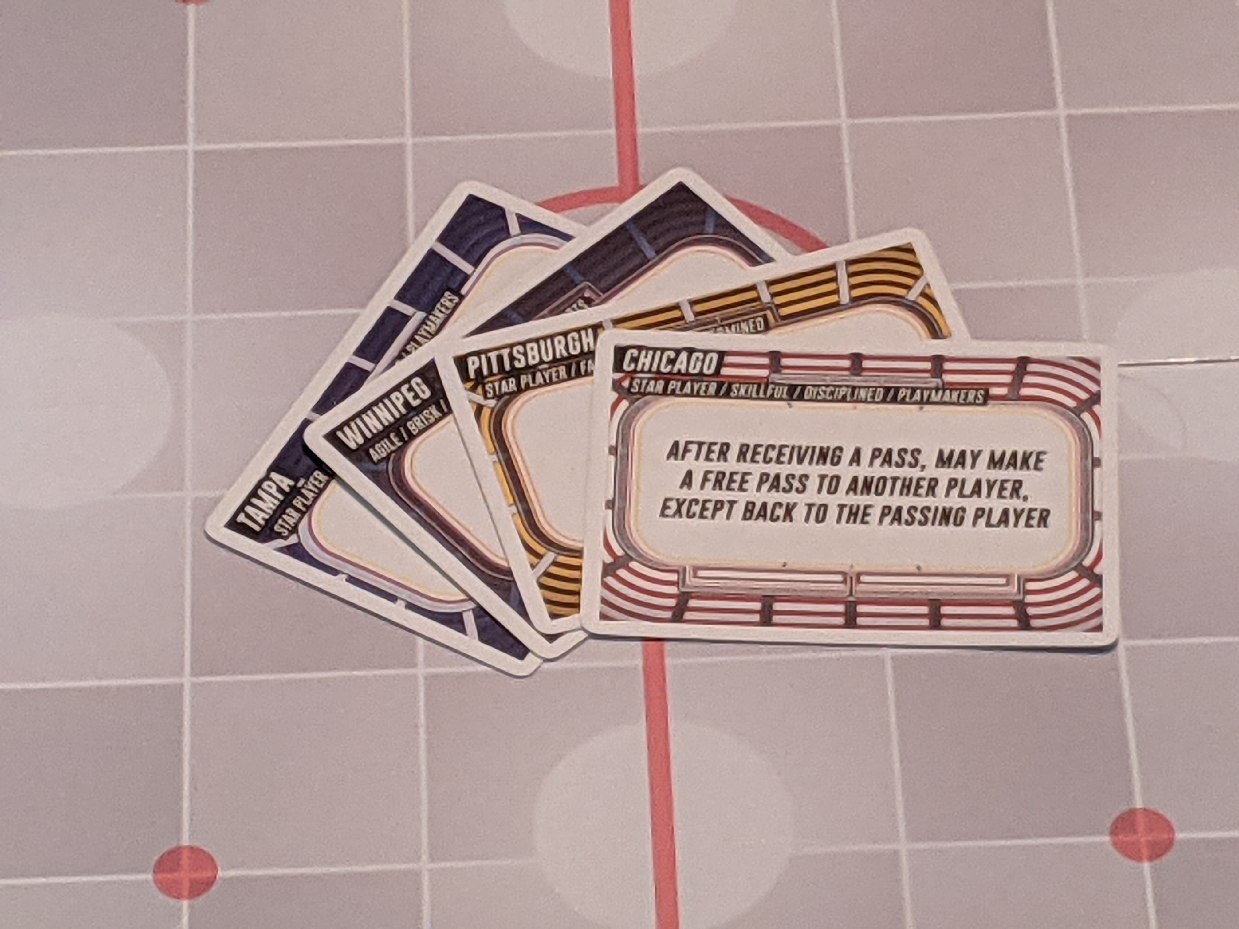 Arenas for four of the teams on offer.You can also choose an Arena Card which gives a special rule to both teams, one for each NHL city (including Seattle, thus saving our friends in the Emerald City from the terrible fate of Vancouver fandom). Each of these cards also includes a suggested set of four Line Cards that are themed around that city’s NHL team. Boston is Hard-Hitting, Tough, Disrupting, and Face-Off Masters, making them a very physical and defensive team that benefits from their Arena ability, which allows both teams to restore 1 stamina before they throw a hit. Washington, D.C. has the Skillful, Agile, Offensive, and Snipers Line Cards, letting them move the puck almost with impunity, but at the cost of an Arena Card that prevents the team with the puck from making a line change – Alex Ovechkin, if your ears are burning, now you know why. And Chicago has the Star Player, Skillful, Disciplined, and Playmakers lines, letting them move the puck nicely on offense but maintaining a two-way defense that can be frustrating to play around, especially combined with their Arena, which lets a player who receives a pass immediately pass without rolling, so long as they don’t return it to the passing player.