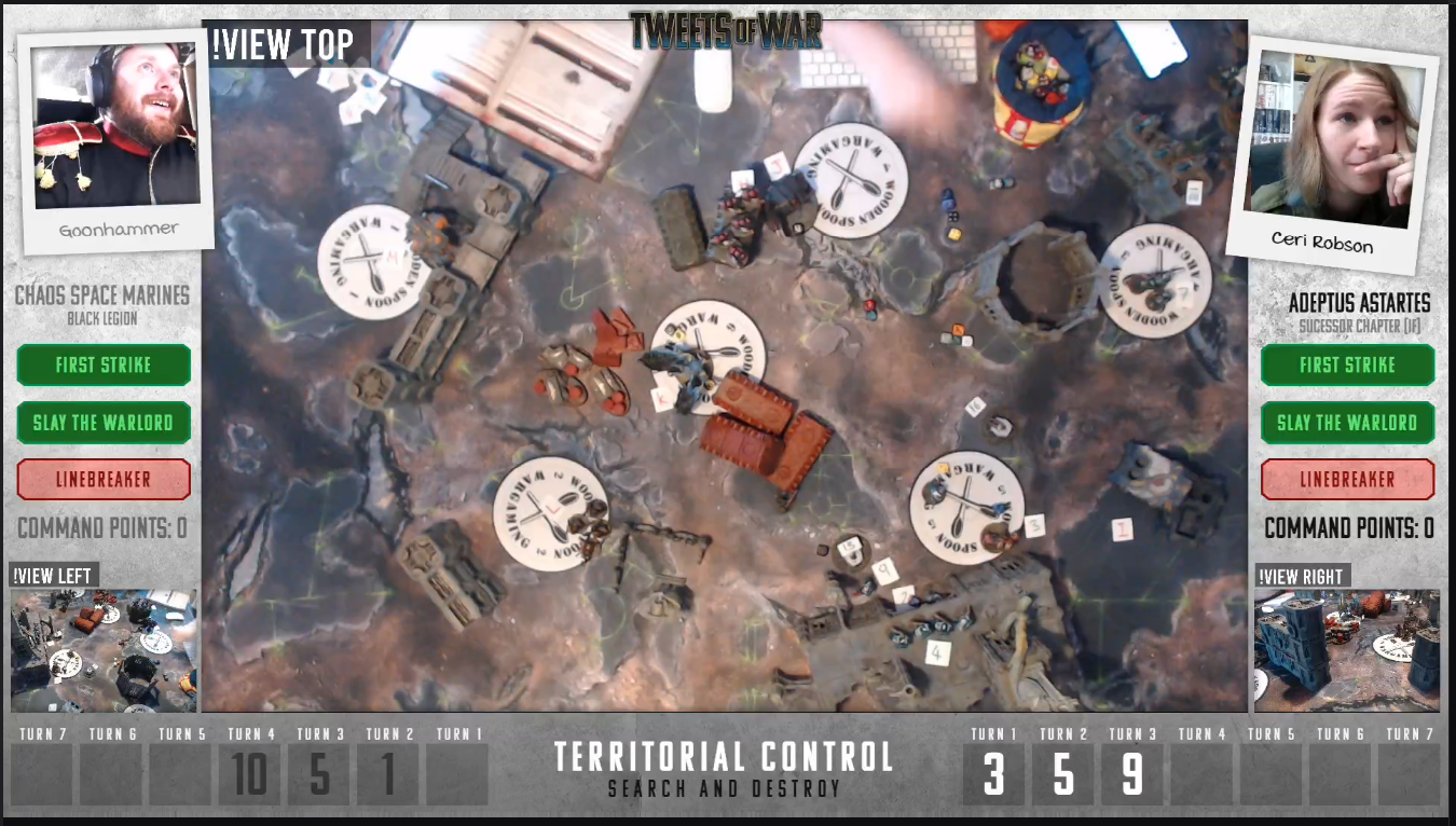 The Game In Progress. Note the themed costumes. Credit The Hobby RoomEach of us made a new twitter account and instead of directly taking command of our armies, we had 1 tweet per unit, per turn. Also The person moving the models has no idea what the objectives each player has to achieve in the game or which player owns which army.