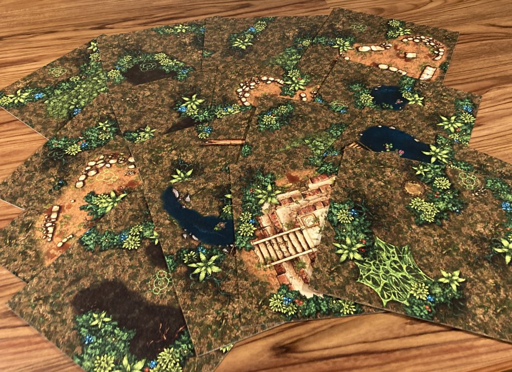 Here are some photos of the first draft of a printed Twisted Jungle tile set, both stacked facedown with the "forest marble" backside showing and with all 16 tiles arrayed: