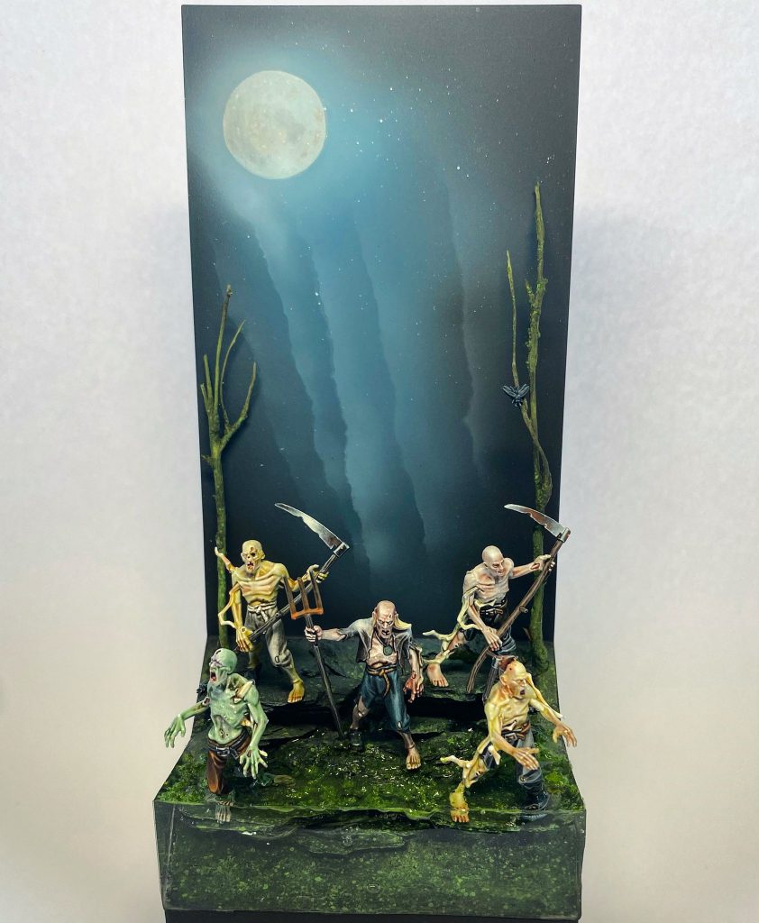 And probably my two favorite pieces are my AoS unit, which is a squad of Deadwalker Zombies with a backdrop with the moon and some swamp situation happening.