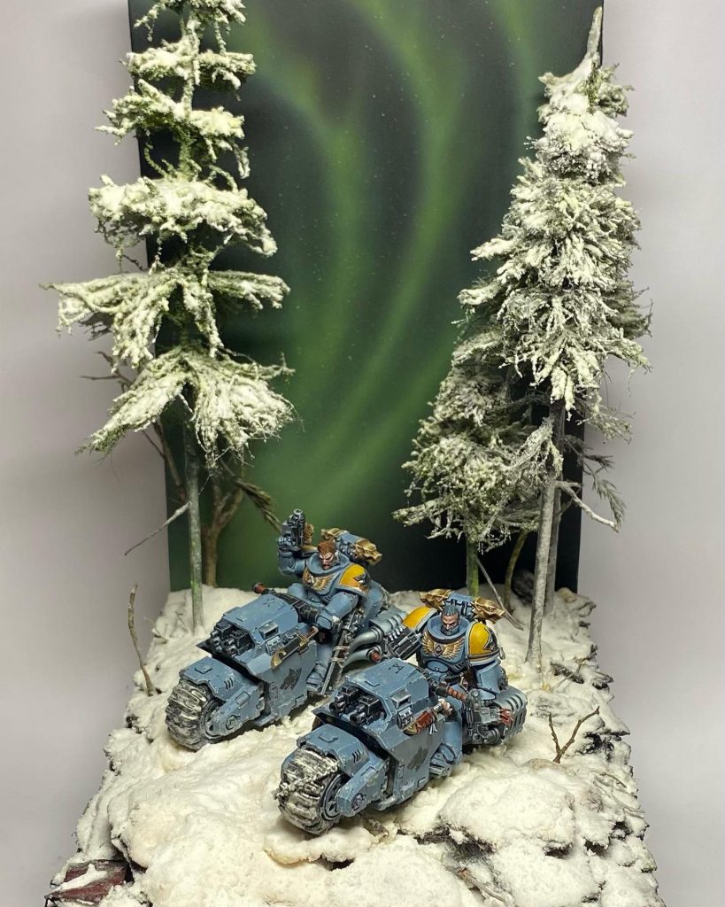 I've also built a diorama with two Space Wolf bikers, and it's based on an old Space Wolves artwork from the Space Wolf products. And I'm very happy with it. That was the first time I've created a backdrop on a piece. So I've free handed some Northern Lights fitting for Fenris probably.