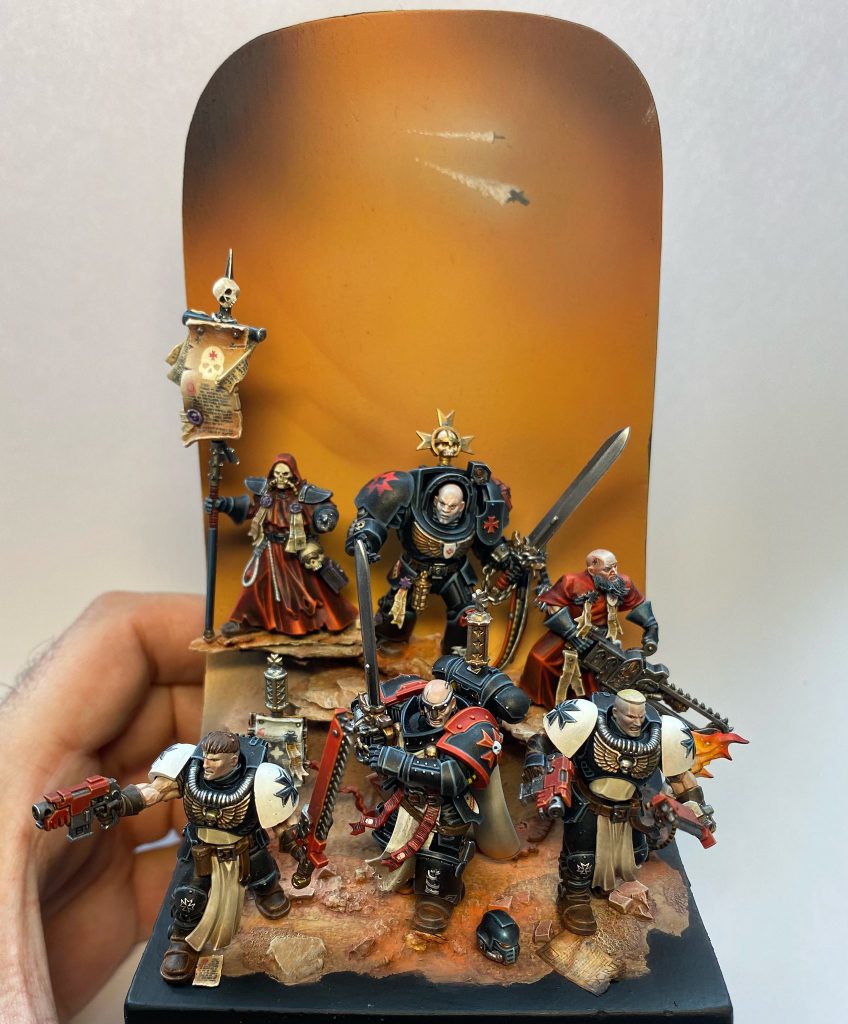 And then I have a squad of Black Templars with a nice backdrop to look like the John Blanche legendary Black Templar artwork.