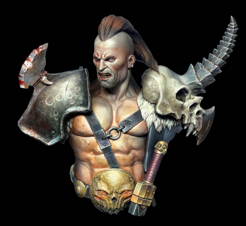 Darkoath Cheiftan. Credit - @MamikonPaintsAnd also a custom bust of Darkoath Chieftain in Open, which has been sculpted for me by my friend Timur Goryuk. I think because I really enjoy the 'Eavy Metal style, and I paint mostly in that clean box art stylistic, I get a lot of comments saying, "This is great, but you probably can't do anything else." So sometimes I want to silence the haters and create something completely different with just this non-metallic all around with some shiny bits that wouldn't be usually displayed on 'Eavy Metal kind of paint jobs. So very happy about that one and hoping it would grab a trophy of some sort sooner or later.
