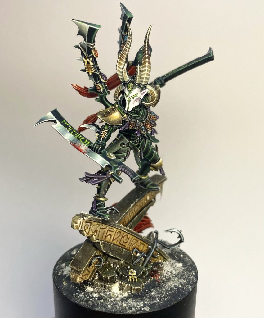 Drazhar. Credit - @MamikonPaintsFor Warhammer 40K single, I have Drazhar - probably my best entry quality wise because I've spent like 200 plus hours on it. And before this competition, I only entered it once to Golden Demon in the US - I got a commended card, which is probably a fourth kind of place. So I was pretty close to the podium and I thought I have to improve something. So I sought advice from people and just improved a few parts, and now I'm much more happy with it and more confident about it.