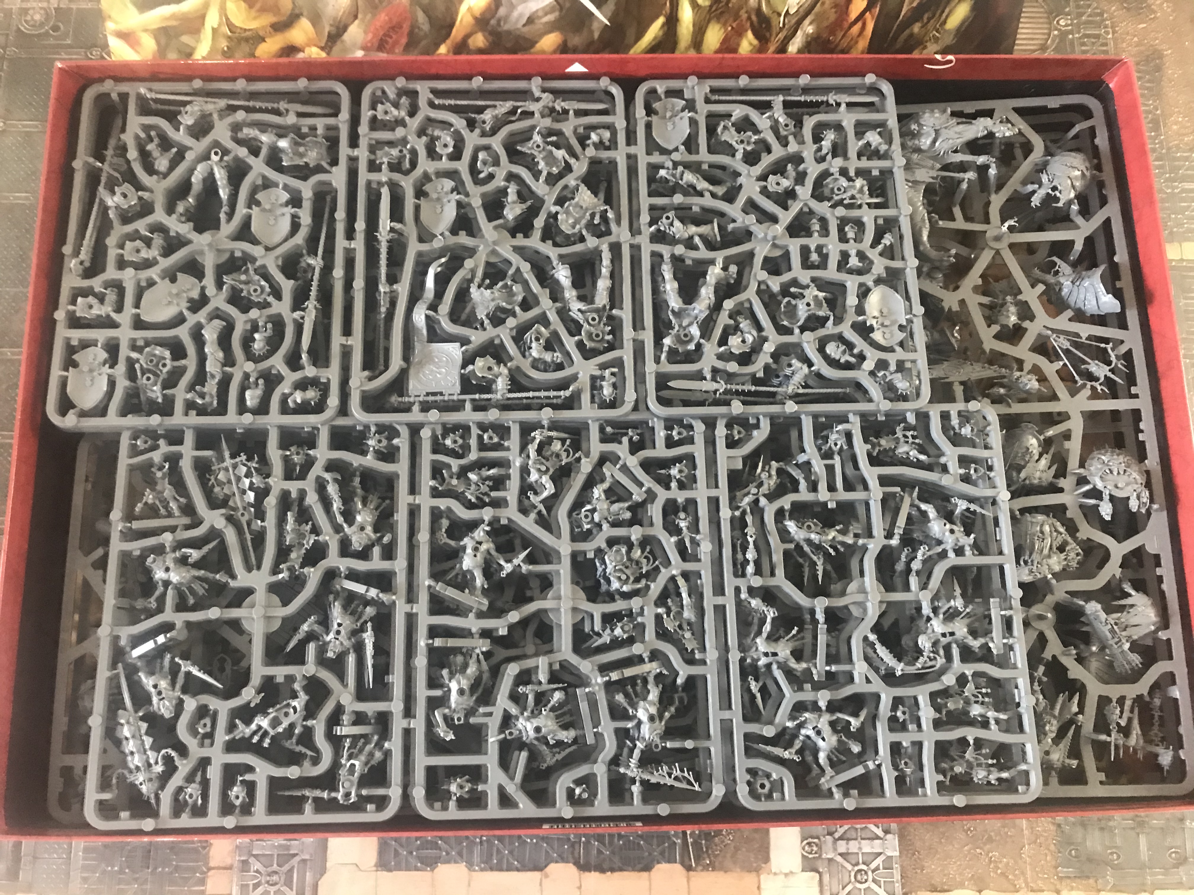 I was much like a hobgob myself, greedily contemplating the contents withinWhat that means is that we're likely to see sprues A-H turn up as ETB kits, or in the three-tiered starter sets that will presumably come out in a few weeks' time to mirror the 40k versions, while sprues I and J are likely to get a separate release akin to the "Heroes of the Imperium" or "Royal Court" sprues for Marines/Necrons respectively. It's probably not surprising this is how it's broken out; the Killaboss and Yndrasta are the two biggest-ticket items in the box, and possibly the biggest that have been in this kind of box release in general, and they were unlikely to want to sell them in future as part of a "starter" set (expect the lower-tier characters to take up the hero positions in those, probably the Lord-Imperant and the Killaboss on foot) so it makes sense to bundle those in with some other units for a premium sprue.