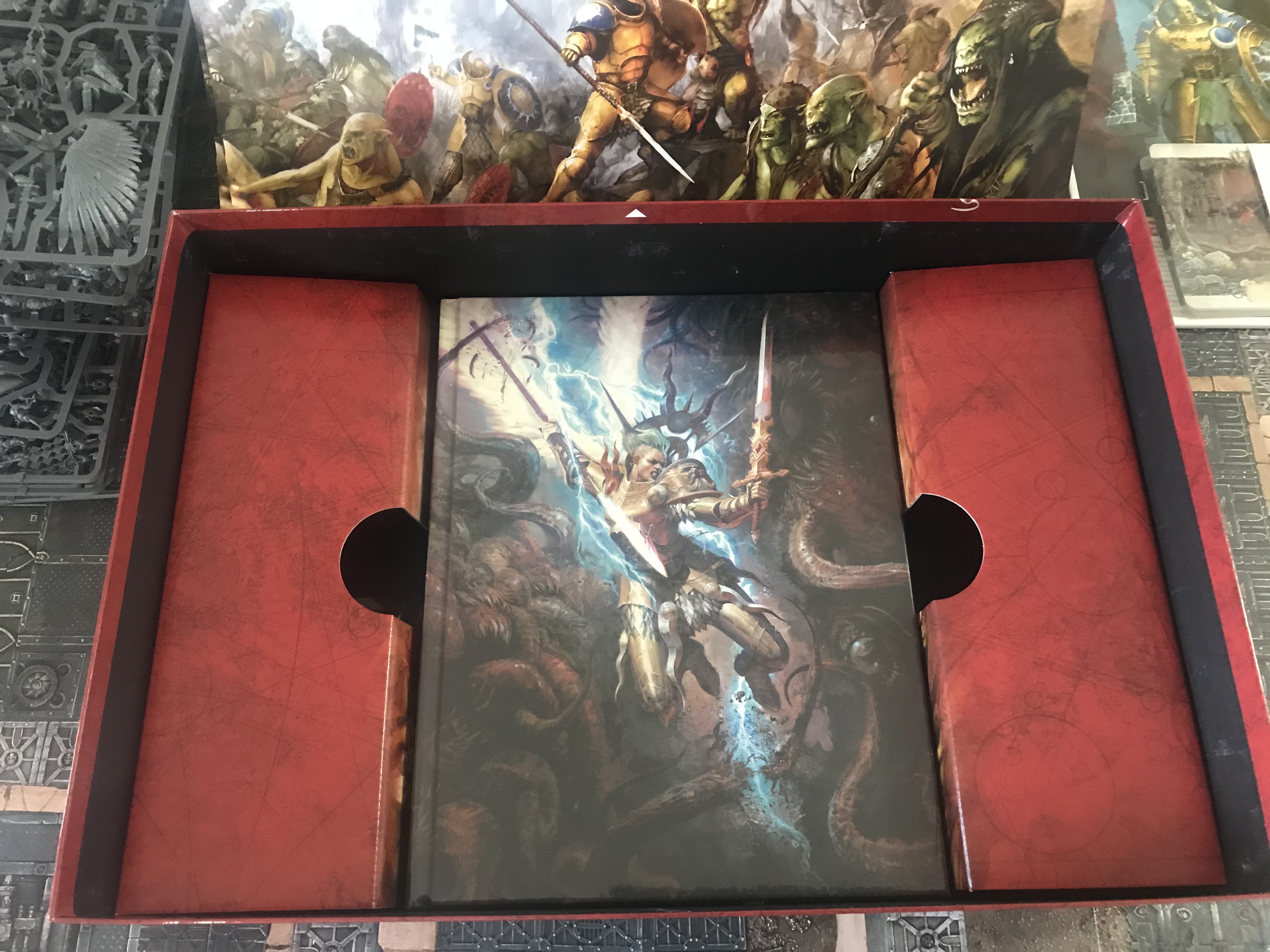 Seriously the art rulesIf leaping in with both feet to the core rules and the full range of the Age of Sigmar setting (lovingly documented in an extensive background section) feels like a bit much to be getting on with, there's a "Start Here" booklet included too, featuring the War at Amberstone Watch, a short summary of the fluff for the box armies. There's no rules content, however; that's reserved for the separate Warscroll cards which detail the various units. The cards are nice quality, and also confirm just how much stuff is here - you get over 1300pts of Stormcast in the box, and around 1150 of Kruleboyz. You're over halfway to a new Orruk horde or over 2/3rds of the way to a Stormcast army with just the contents of this box, which is a frankly unprecedented amount of stuff for a single set like this - the Marine half of Indomitus was around 900pts. I am not much more than Age of Sigmar-curious (I have a DoK army in the backlog which has been stalled out for a while) but I am going to end up with a Stormcast army just based on getting this box, since it should be relatively trivial to reach 2k with only a couple of extra purchases. Better-informed minds tell me the box contents are actually pretty good, too; whether you'd use absolutely all of it in a competitive 2000pt army remains to be seen, but you could at least reasonably put this + a few extras on the table and be fine.