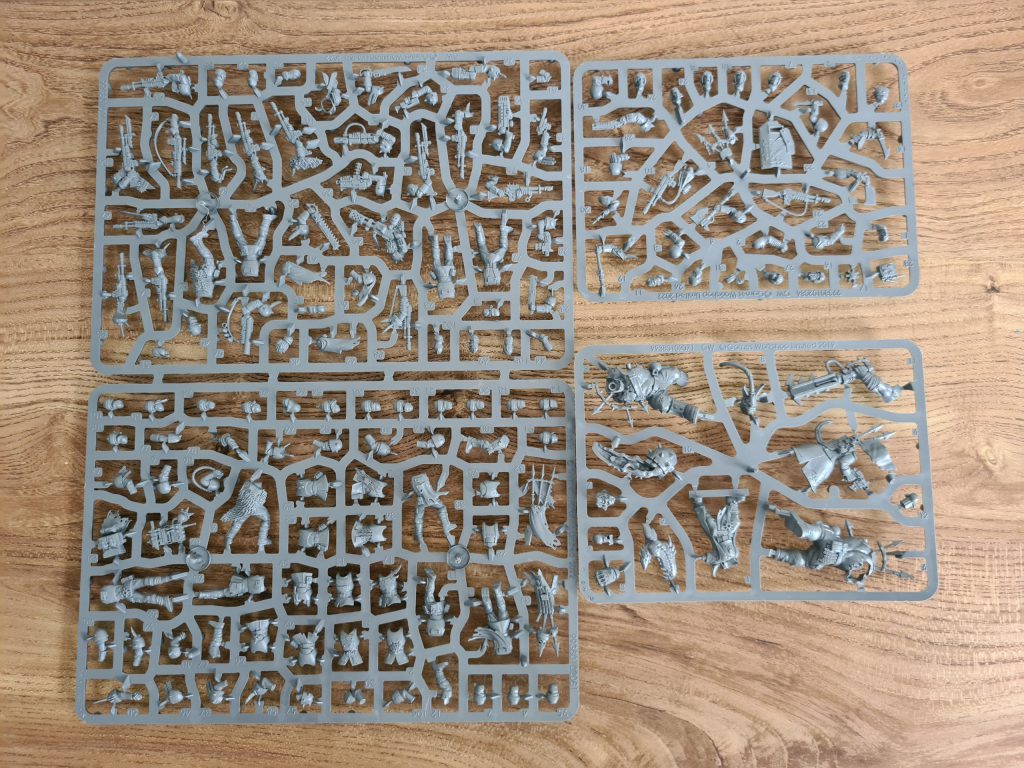 You get 10 in the box, with two sprues of what looks like a standard Traitor Guardsmen kit and then an upgrade sprue similar to the one for their Phobos boxmates, which contains most of the bits you use for building your specialists. Splitting the two things out is probably a good indicator for the future of these kits when they're released separately, but it also helps to keep the sprues a lot neater - the worst feature of the kits for both the Ork Kommandos and the Corsairs is that they are packed to the gills with stuff and have clearly been organised to facilitiate Maximum Stuff instead of easy usability, leading to models being built from parts strewn all over the place. That isn't the case here; your two core sprues cover building the guys, with parts mostly kept together logically (the chest pieces aren't with the legs they go with, but are all placed together, so they're still easy to find), and then the upgrade sprue segregates the majority of cool toys onto a separate place of their own. As a result these are much easier and more pleasant to build than some of their predecessor Kill Teams.