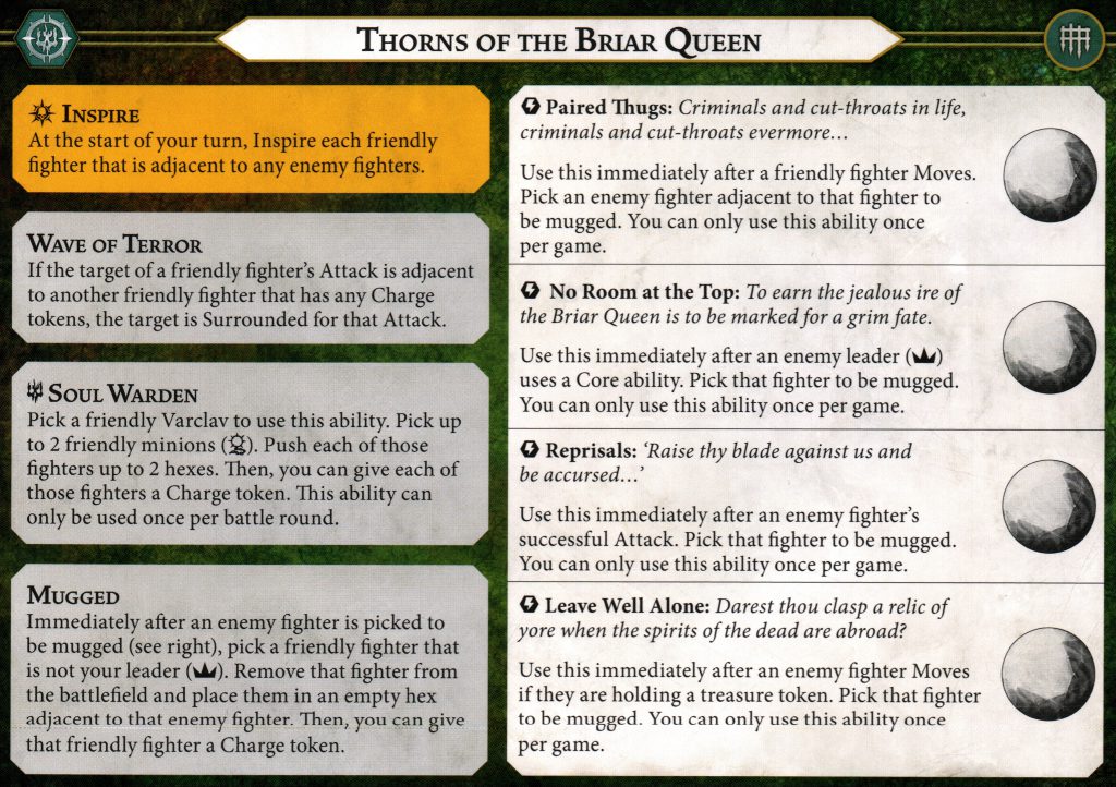 Speaking of pushes and teleports, the Thorns of the Briar Queen sure have a lot of options!This leads well into the next category, objective scoring. Many of the objectives in Underworlds have a requirement of your fighter(s) being in certain locations on the board, whether it's specific territory, on a feature token, or being adjacent to other fighters. Being able to utilize these repositioning effects can get your fighters in the right spot and be the difference between winning and losing a game. They're also great for aggressive objectives because a push allows you to get a fighter into attack range without needing to charge. This sets the fighter up to continue making attacks in future activations which can be helpful if you're fishing for something like Perfect Strike when using your most accurate fighter. "Use Sidestep to get on a token" isn't revolutionary gameplay but it's been a strong tactic since the very first days of Underworlds almost 8 years ago.