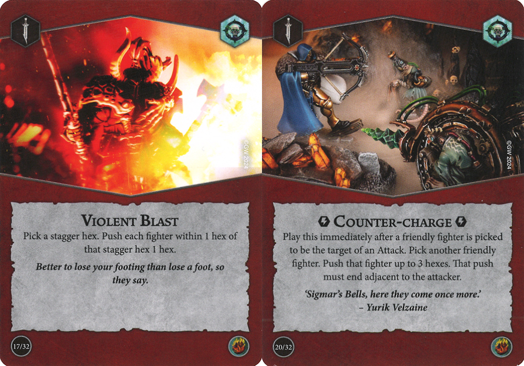 There are a variety of pushes and teleports available to warbands on their warscrolls, but for now I'm going to focus on the cards you can find in the various Rivals decks. I'll be covering the decks in release order and highlight the positioning cards that they each have in their respective power decks. This can be a handy way to shop for a second deck pairing in Nemesis, or just let you know what tech various decks offer to you or your opponent in terms of pushing fighters around.Blazing Assault