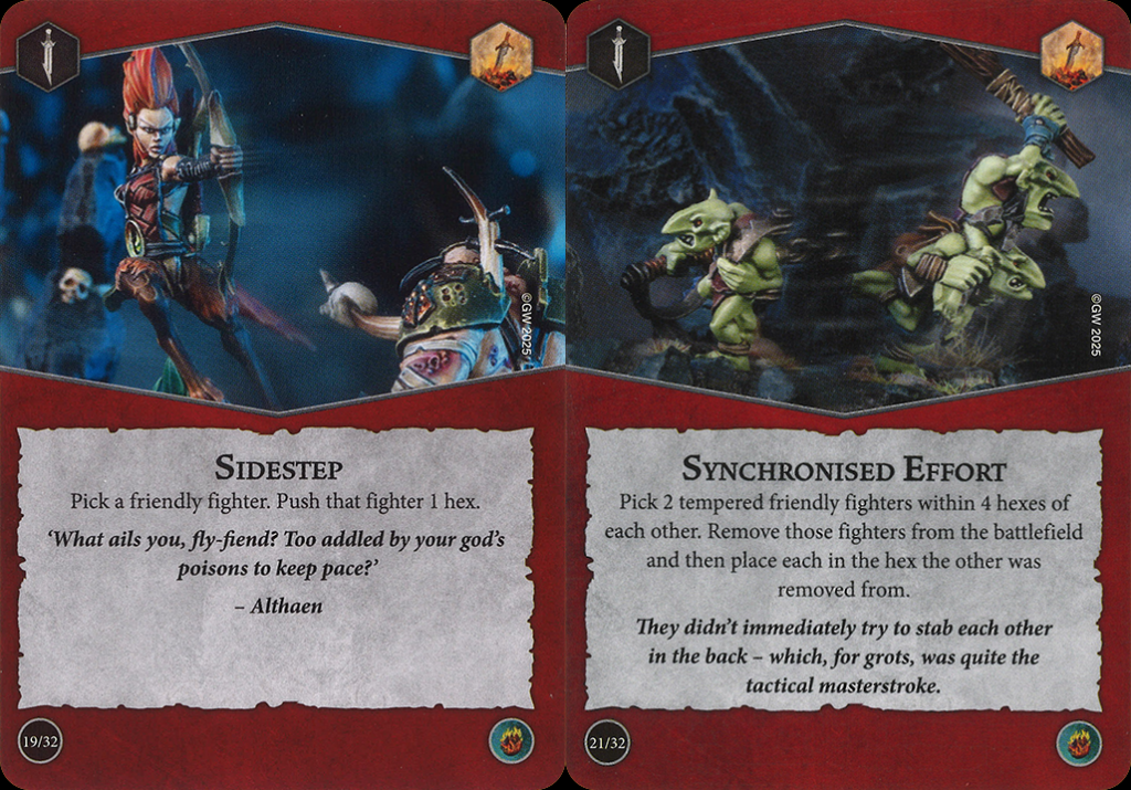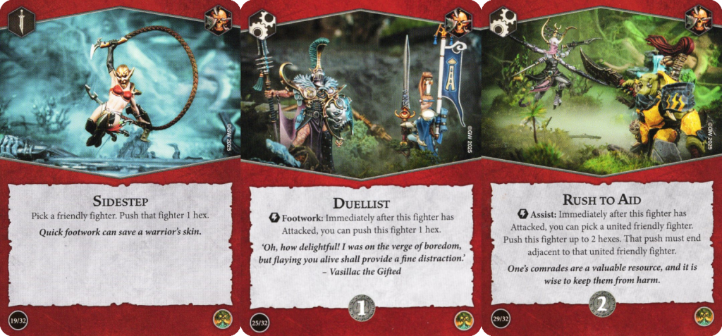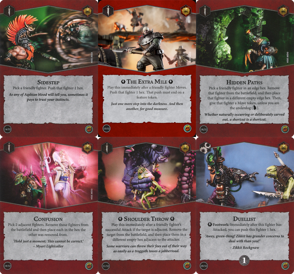 Hey look, it's Sidestep again. While Sidestep in Blazing Assault will often be used to extend threat ranges, it's fantastic in Emberstone Sentinels for securing treasure tokens. Use it to hop onto one just out of reach of a move, use it after taking the Guard action to solidly secure one adjacent to your fighter, or even use it after one of your fighters has been driven off a token to hop right back on.