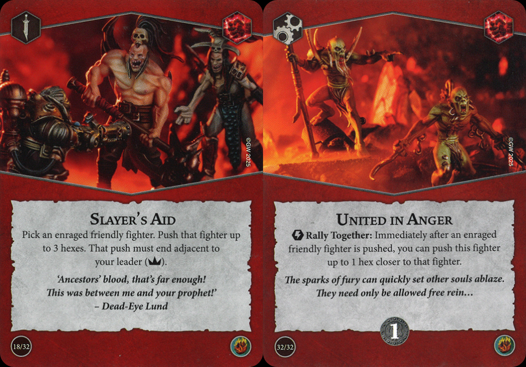 Credit: UnderworldsDB.comSlayer's Aid is… weird. You can only use it on a fighter that's already charged and it can only be pushed toward your leader. Three hexes is a substantial amount, but the additional restrictions really reign this card's usefulness in and that's not even taking into account that it's a dead card if your leader is slain.