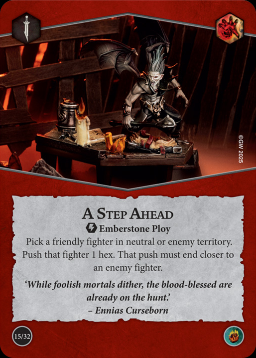 Credit: UnderworldsDB.comA Step Ahead is one of the best Emberstone cards this deck has, and considering so much of the deck requires you to include Emberstone cards it's nice that at least one of them can be a payoff instead of a tax. Sure, you have to pick a fighter in neutral or enemy territory. Sure, the push has to be toward an enemy. You're not going to be able to run away when using A Step Ahead. As I've said a few times though, even a bad Sidestep is still a good card and that's what this is.