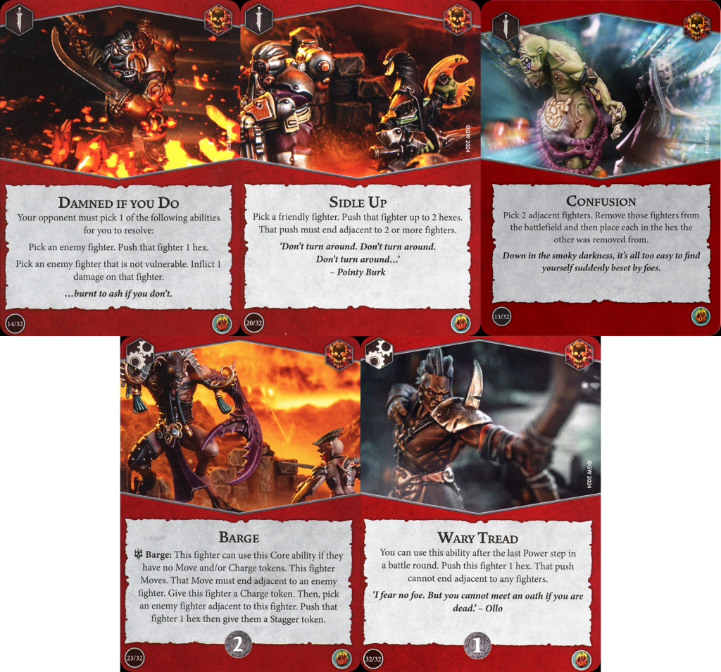 Commanding Stride has a leg up over Sidestep in the number of hexes pushed, but two substantial downsides in that you have to end the push on a starting hex and only your leader is capable of being the target of this effect. Leader focused warbands like Mollog's Mob, Headsmen's Curse, or Cyreni's Razors will be able to make the most of this, but even straightforward elites like Gorechosen of Dromm or Morgok's Krushas can take advantage of what's often times a free full move in the power step.