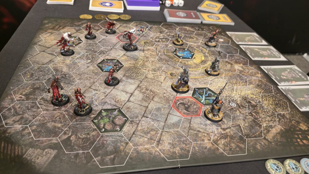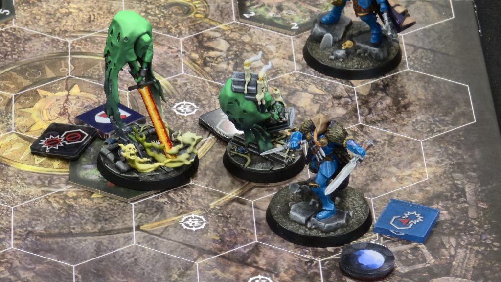 Slythael is terrifying with her range 2 attack that can one-shot most of my ghosts and already comes with ensnare and cleave. I wanted to focus her down ASAP in every game, but I also couldn't afford to ignore Drusylla because she's just as scary. I learned the hard way that even the dinky archer is a legitimate threat. Thomas played expertly and was another player to outright deny one of my muggings in every single game – in this case, he never moved a fighter onto a treasure token. I tried my best to fight around them, but he did a great job.