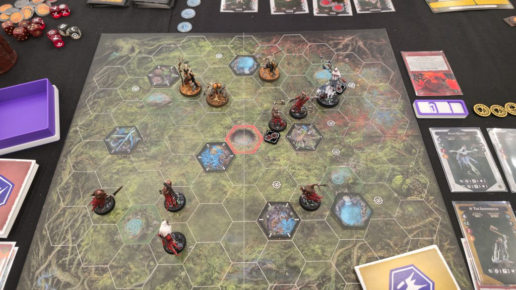 The final round of the day was against Maks from Canada. He brought Zarbag's Gitz with Countdown to Cataclysm and Pillage & Plunder, my old enemy. I'd practiced against this warband a fair bit leading up to this event and despite that, it's still a difficult match for me. I also forgot to take pictures here and became even more forgetful as the event went on.This was also the first time I played against a Gitz opponent and saw the joy in their eyes as they realized that they could choose the Spitewood board in an orientation that places two of our starting hexes adjacent and get to place the first fighter. This means Maks got to plop down Snirk in that forward starting hex, I'm forced to place a fighter adjacent to him at some point, and thus take a damage before the game even starts. Ouch.