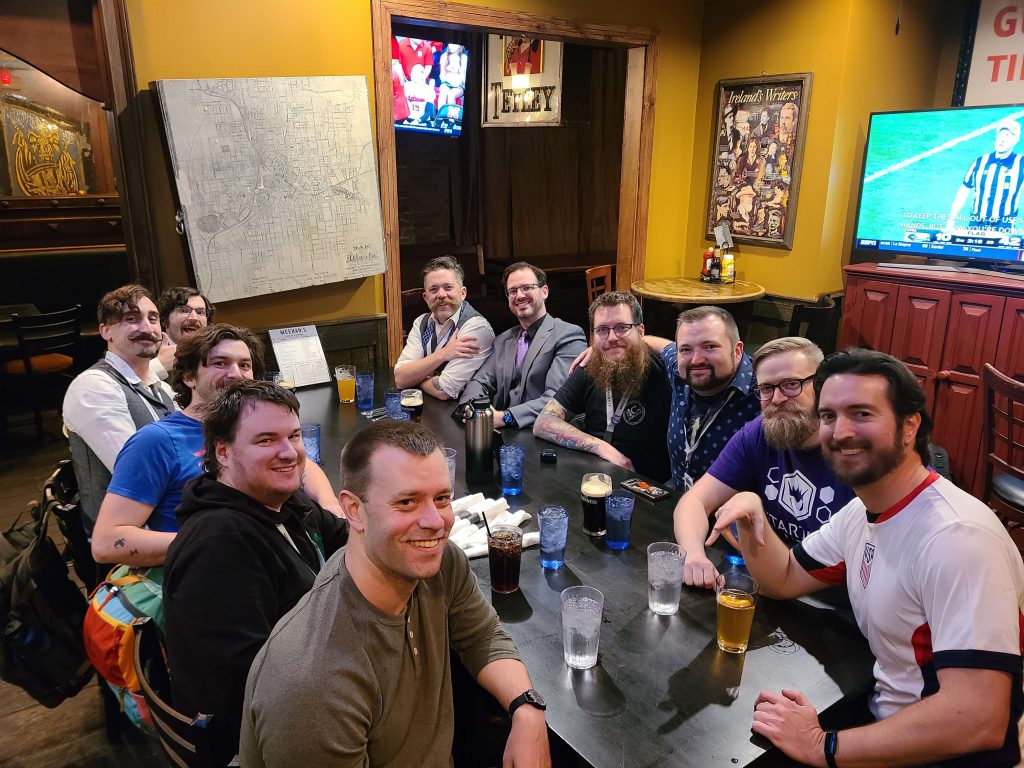 Dinner after the first day has wrapped up. Credit: JesseEnding the day 1-2 overall obviously isn't ideal, but I was actually in a pretty good mood. I came into this event halfway expecting to go 0-10 and in a sense I had already done better than my goal. I won a round! A group of us went out for dinner that evening and a good time was had by all. Except maybe the table of Canadians next to us who all flinched when someone at our table very enthusiastically slammed their Warhammer challenge coin down on the table so loud it sounded like a gunshot. Welcome to America, I guess!