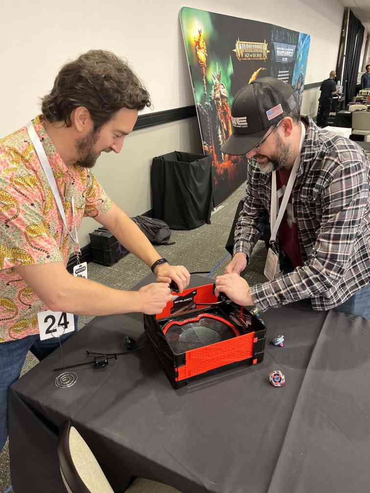 Let it rip! Beyblades over lunch was a hit. Credit: SaxthomAdditionally, I need to highlight the fact that Thomas brought a Beyblade arena to the event. He set it up and passers by would look confused and/or intrigued, rip a few blades (or whatever the slang is for spinning metal death tops), then walk away with a smile.
