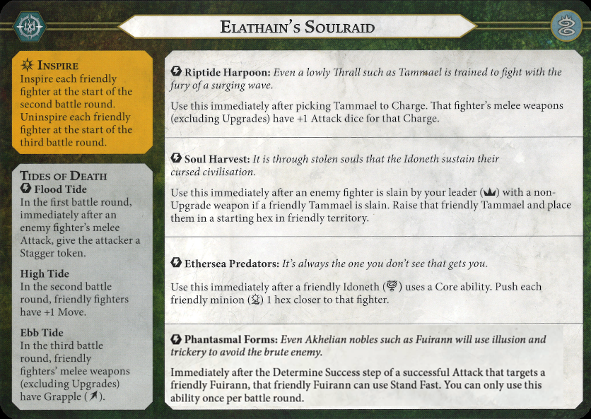 Overall, this was a fun experience and I plan to play this warband more in the future. They have a lot of cool tricks and are flexible enough to be taken in many directions. Maybe I'll try out some all-out aggressive plan with them in the future and see how many souls Elathain is capable of reaping.As for the deck pairings, I think the ES/RF experiment was fun and informative. It's a different approach to a flex playstyle with decks that aren't seen quite as much in the meta and certainly not in this combination. I'm still fond of the pairing and want to try it with some other warbands in the future, but once I tried out the BA/PP pairing here it felt like I was just trying to reinvent the wheel.