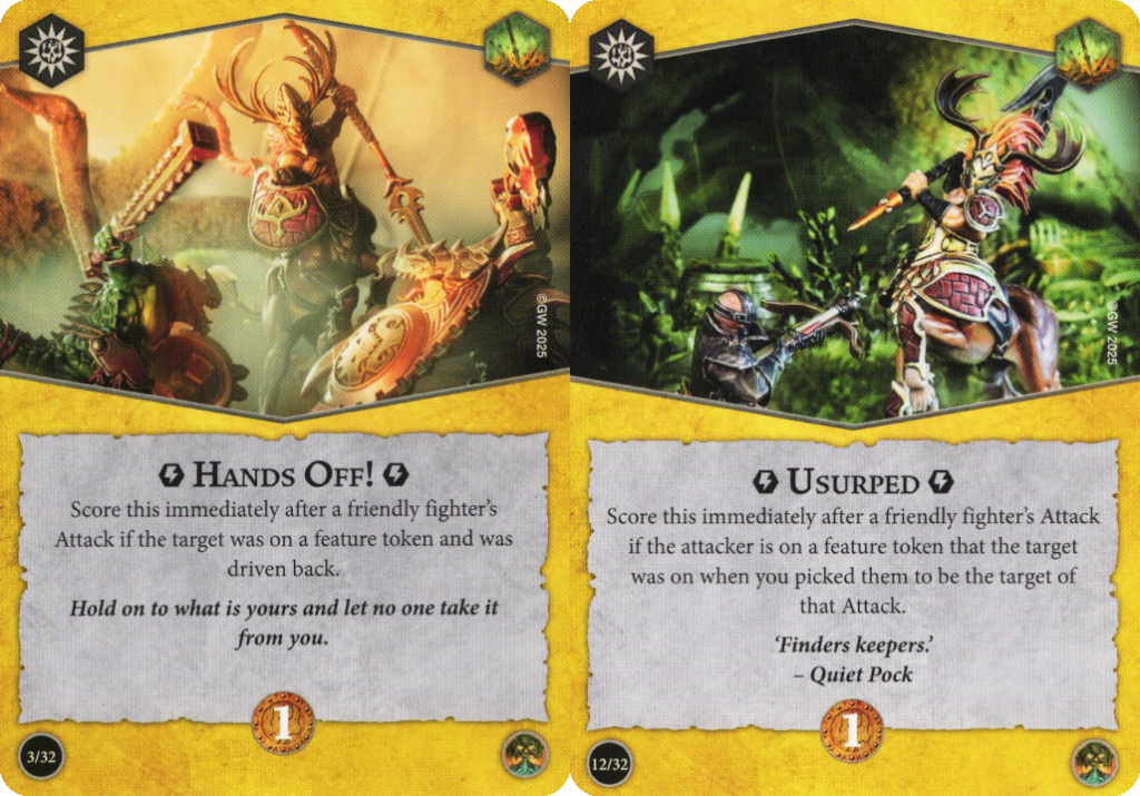 Credit: UnderworldsDB.comHands Off! is convenient because you're typically going to want to drive your opponent off of feature tokens if they're trying to stand on them anyway. For some warbands and game plans, they're going to naturally want to do this. Against an aggressive opponent who doesn't care about feature tokens, the introduction of AG tokens gives them a reason to want to. Otherwise, you're limited to working pretty hard to drive enemies back onto a token just so you can drive them off again.