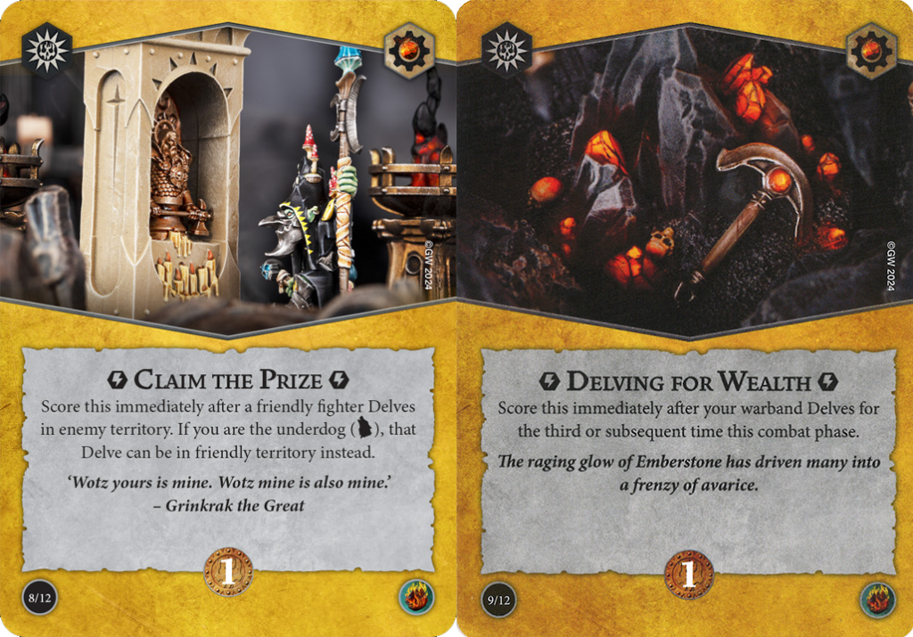 Speaking of hard to counter objectives, Delving for Wealth is the other restricted card in Pillage & Plunder. It, like Claim the Prize, doesn't care what your fighters are delving as long as they do it three times. Again, this likely won't be the main route to scoring this objective but there are a few niche cases where it can come in handy. For instance, delving AG tokens if you're up against Deadly Synergy in order to never hold a treasure token which can block them from scoring Closed Down.
