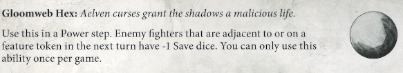 Credit: UnderworldsDB.comGloomweb Hex is another seven-hex bubble that can take advantage of AG tokens as well. It makes it much harder for the opponent to position their valuable fighter somewhere where they can't be hit by this ability and made susceptible to a deadly elf dive, even if that target isn't intentionally standing on or near a token.