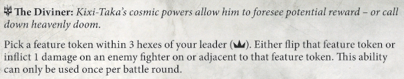 Credit: UnderworldsDB.comKixi-Taka already has a very strong ability in The Diviner. Being able to inflict a damage without any dice rolls or caring if the enemy is vulnerable is quite threatening and it can be used up to three times in a single game. As I mentioned up in the Hunting Grounds discussion, each feature token creates a little seven-hex bubble of danger when Kixi-Taka is on the board. Adding AG tokens to the mix – your own and your opponent's – creates even more hazardous areas for your opponent to try and navigate around.