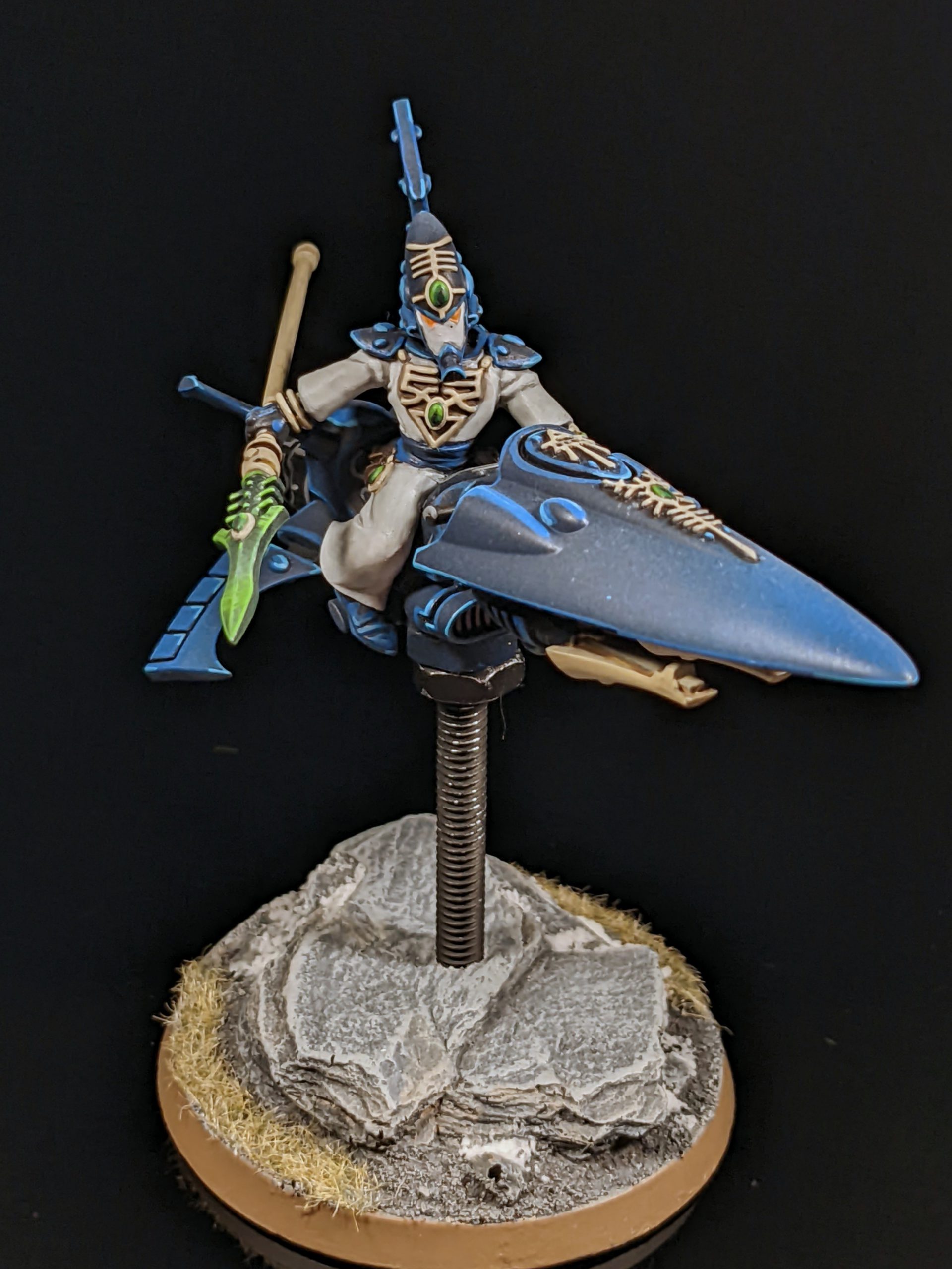 A Farseer on a bike! He carries a lot of the same abilities as the foot Farseer. A little more expensive, but gains 7 inches of movement, a pip of toughness, a wound, and a 3+ armor save which means he sometimes doesn’t die from indirect fire. The Skyrunner can join both Windriders (which he actually likes joining and aren’t a bad unit) and the Warlock Skyrunner conclave (by far the worst unit in the book, second only to perhaps the foot Warlock Conclave). Like his walking iteration, he comes with two rules.- Branching Fates: Same as the foot Farseer.