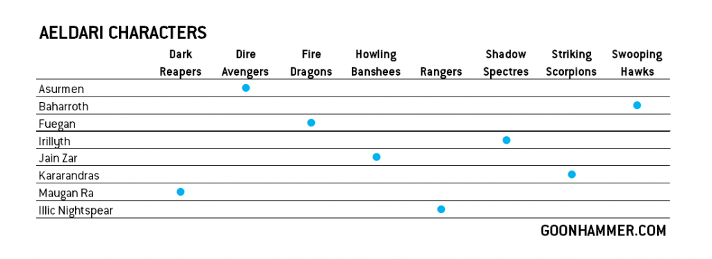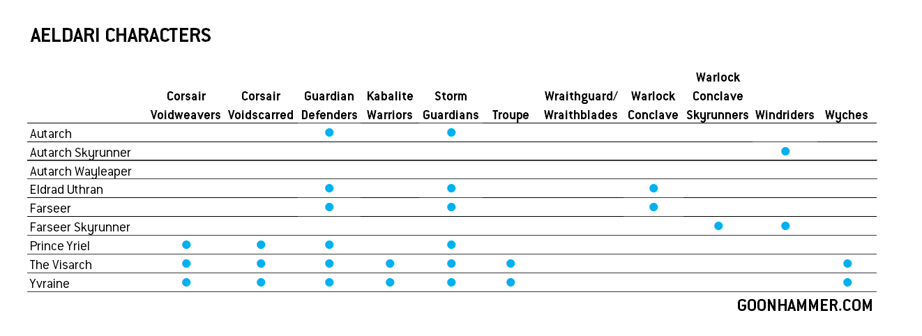 With the heroes of legend out of the way, let's dive into the more common and esoteric characters. The above chart illustrates the matrix of bodyguard options with Yvraine and the Visarch bringing in additional non-Harlequin/Aeldari options.