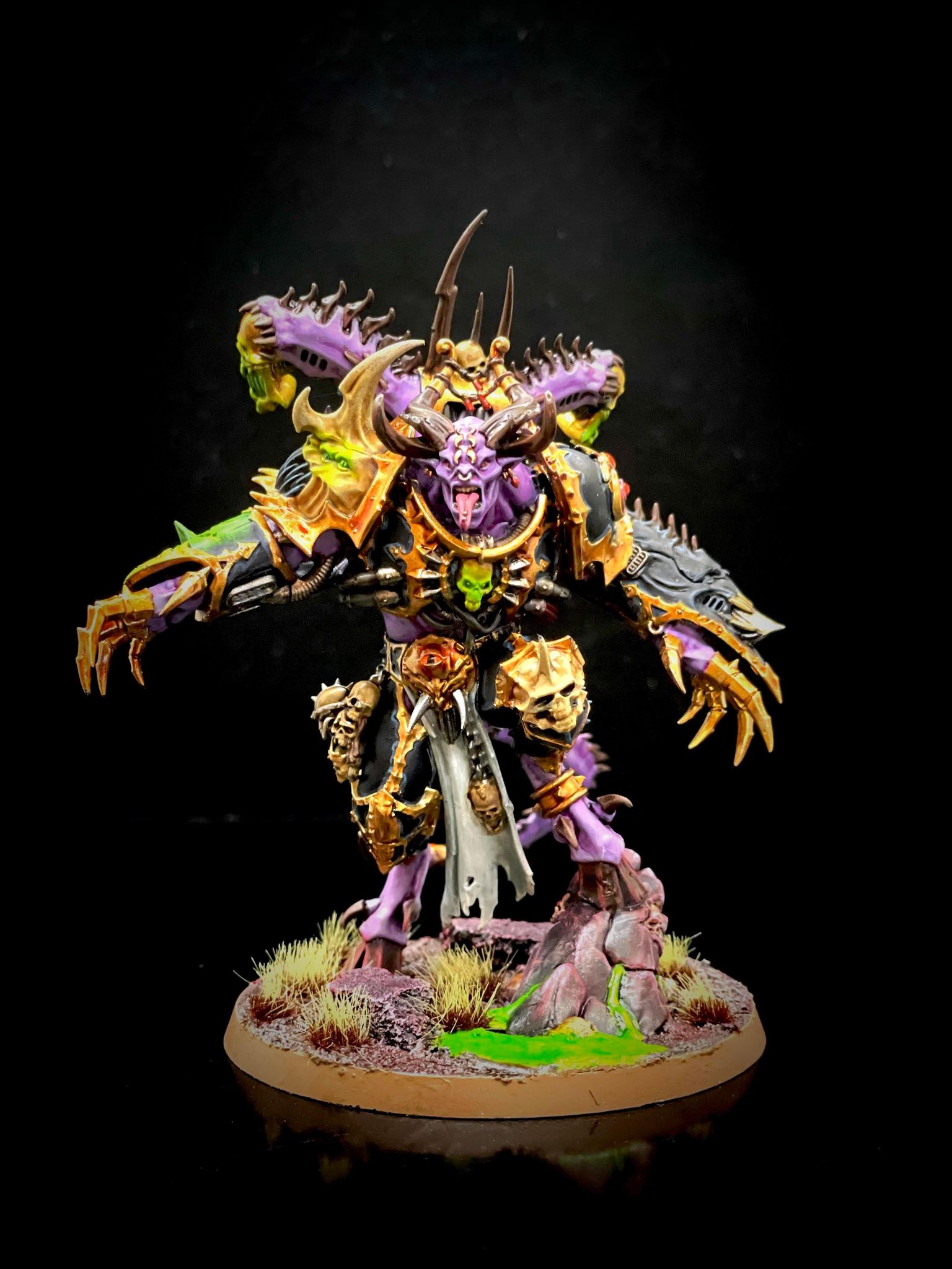At 190 points this guy is just way too expensive for what he does. If you're taking a Lord Discordant I recommend running him with the Baleflamer and Mark of Slaanesh. He's not very good but if you're up against knights he can punch above his weight, though I wouldn't go charging them with him except to finish them off. The extra movement and hits make him much more workable in melee.