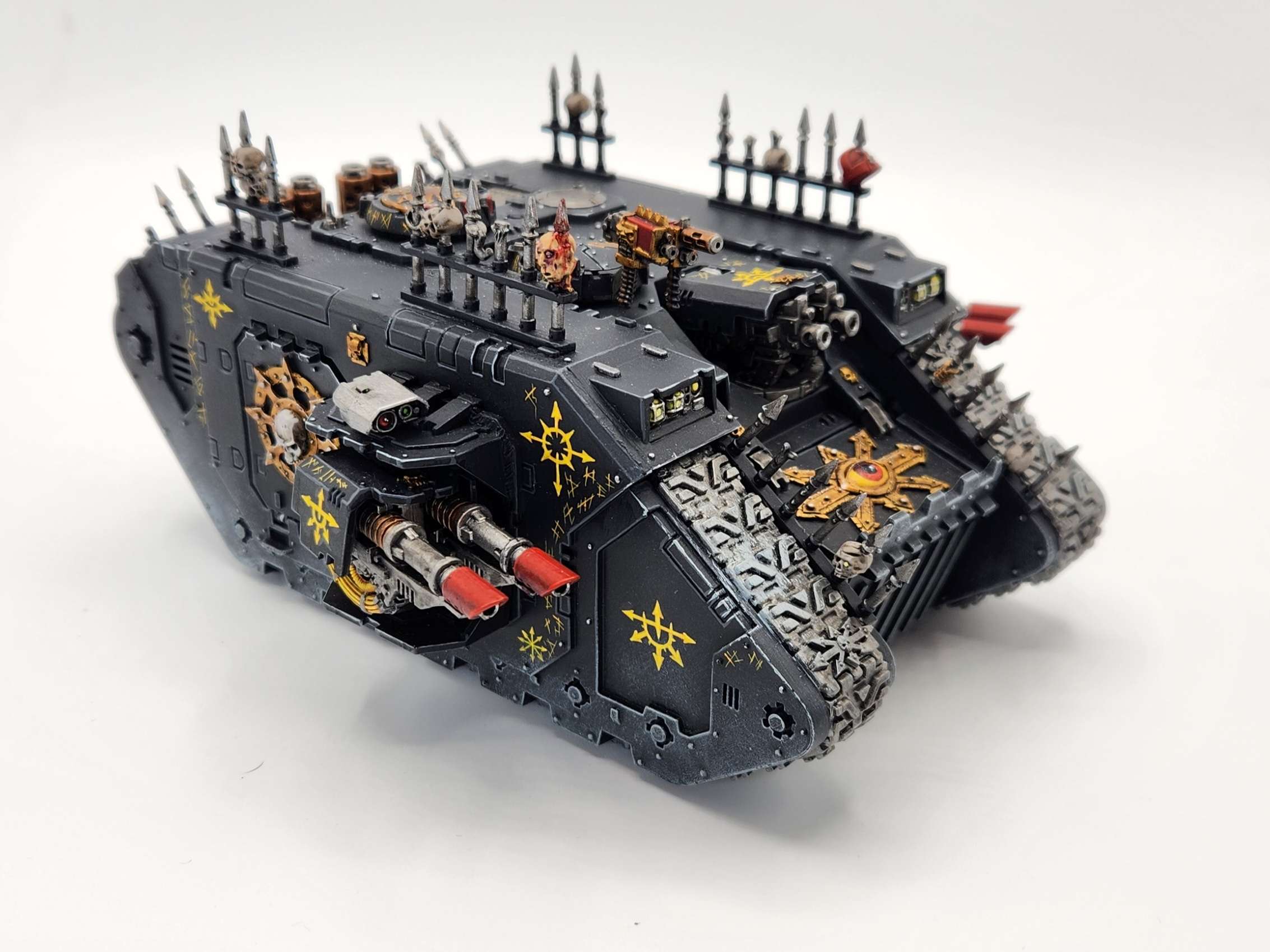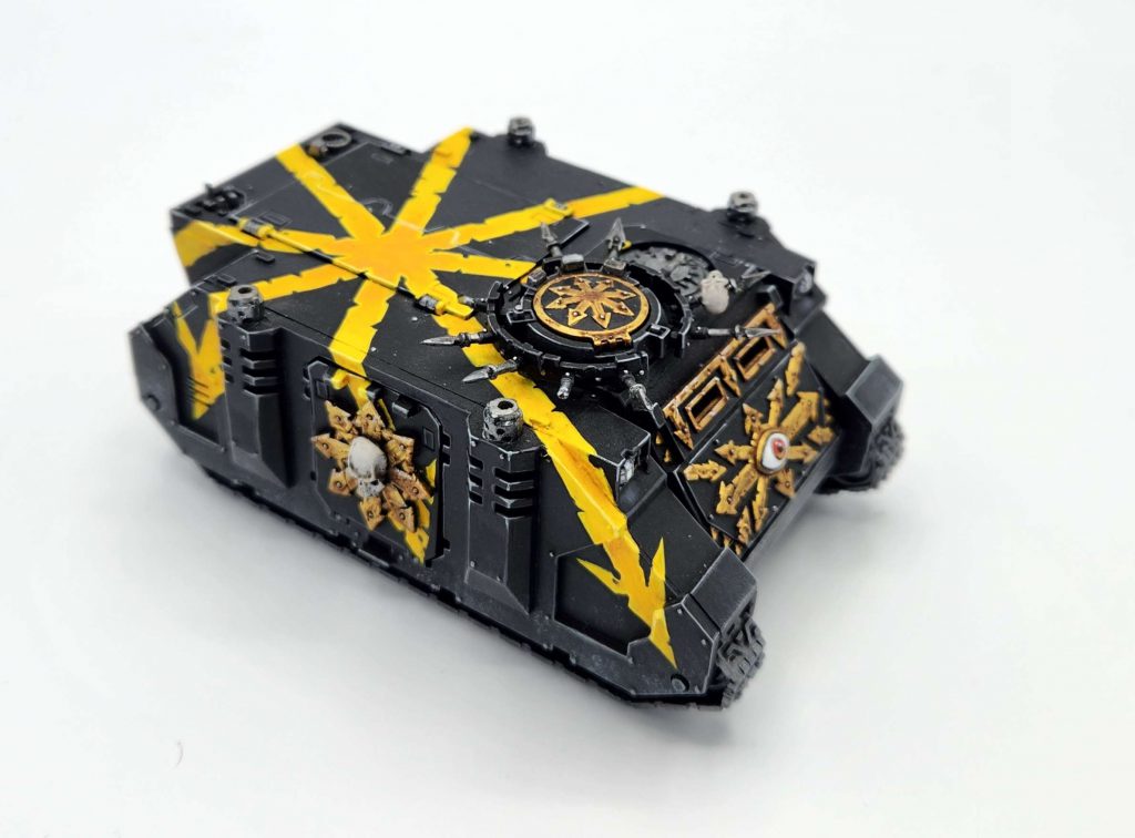 Chaos Land Raiders don't show up often but they're not bad and if you want to run one to carry a unit of Terminators or even Chosen that's just good enough to be playable at a competitive level. Give it the mark of Nurgle to protect it from being destroyed on the first turn and proc extra hits. Use it to run a unit close for a protected charge, and then play aggressively with it after it's loosed its cargo - Land Raiders have a whopping OC 5 and make for very solid objective holders in the middle of the table since they're tough enough to shrug off most small melee attackers.