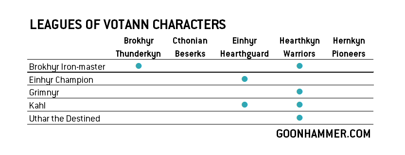 First and foremost, every character is a Leader; there are no Lone Operatives or other non-attachable characters in the faction. The options available are pretty simple, as you can see from the chart above; no character has more than two unit types it can attach to and for most of them the choices boil down to Hearthkyn Warriors plus one other, with only the Einyhr Champion being unable to join the Votann mainstay. This does help a little bit with decision making but also is a little anti-synergistic in comparison to other armies. On the other hand, all the characters are good, so at least you're getting something out of it.