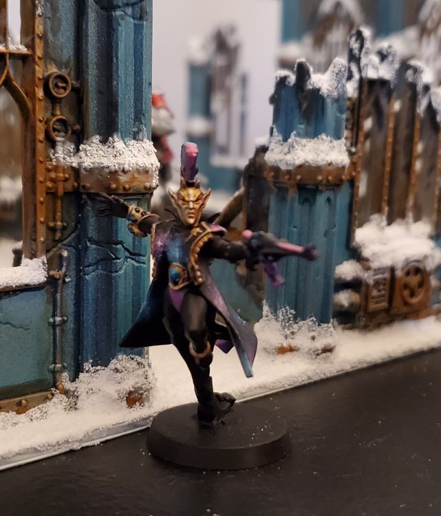 Troupe Master [4 PL, 70pts, -1CP]: Choreographer of War, Darkness’ Bite, Fusion Pistol [5pts], Harlequin’s Blade, Plasma Grenades, Stratagem: Pivotal Role [-1CP], The Twilight Fang
