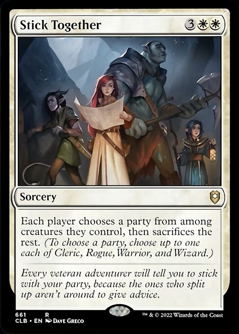 Credit: Wizards of the CoastStick Together is at least a bit more on theme and an interesting card, potentially quite good because it's a sacrifice effect as opposed to destroy, where you could dodge it by maintaining a party, but it feels like it's always going to hurt the deck a fair amount, counting on wrath + indestructible seems a lot more dependable, even if opponents creatures will occasionally also be able to dodge it.