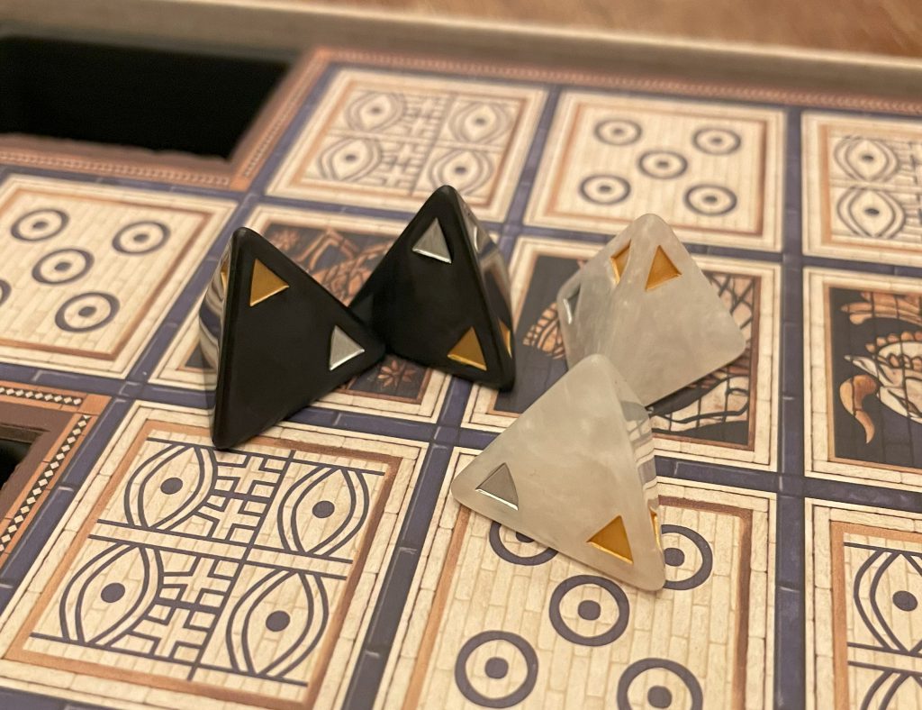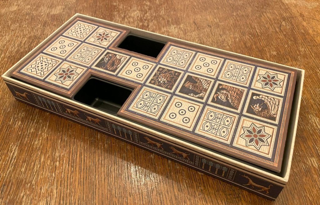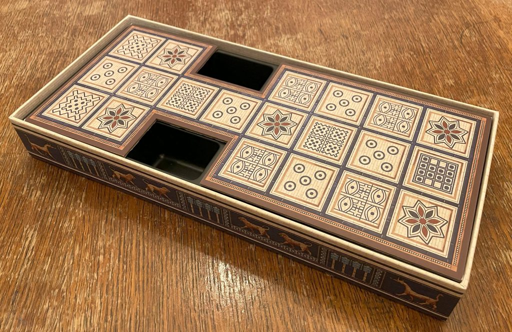 Nicely done original-ish diceIt's a very well produced version of the game aesthetically, with cues from Babylonian and Assyrian art. If the final Kickstarter version looks like the review copy, I'd be very happy with the quality and look of the components received. There's a really nice extra in that the board is double-sided, so you have the "classic" version right there for you too. The board fitting back into the insert is clever - making for a self-contained play area that really evokes the archaeological versions, without the need for a much more expensive wooden box.