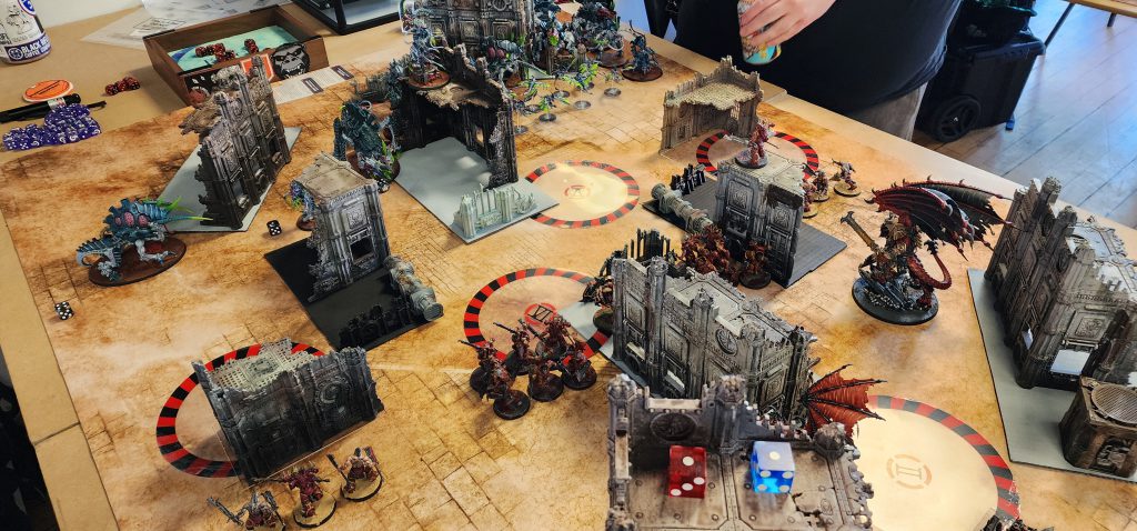 A photo of the final roundComing from the great white north, we have an event out of Vermont. Chris Root’s World Eaters took this one with a list that went very heavy on Eightbound. According to sources on the ground, the final game fully hinged on this game hinged on Chis’ opponent taking out Angron turn one for a decisive blow to the core of his army. His opponent was successful, unfortunately Angron didn't stay down for long, and was back in round 2 to continue wreaking havoc.