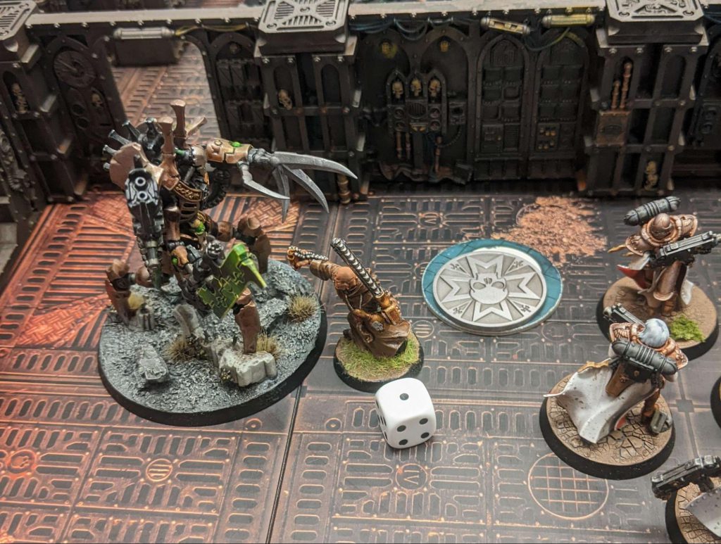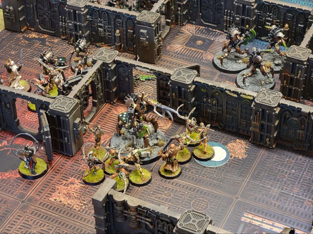 Malioch and Korvash square off amidst the warp-twisted ruins of Miltner’s Docks. Photo: Luke B.Outside Miltner’s Docks, the Trans-Hyperion Alliance have fended off the Space Marines and have managed to secure both the bridge and the engine room of the stricken Auger of Truth. The Votann arrived prepared to exact vengeance on the genestealer cultists of the Departmento Laborum for hijacking their frigates, but it seems that there was only a small token force of the cultists on board…