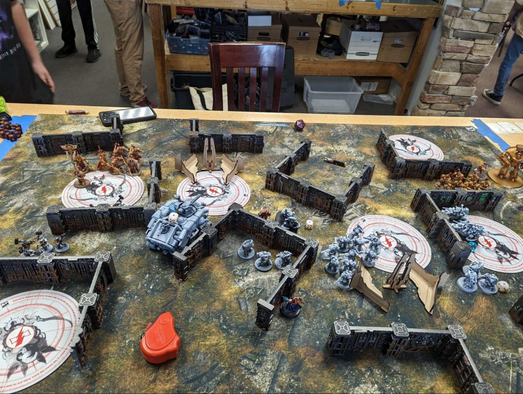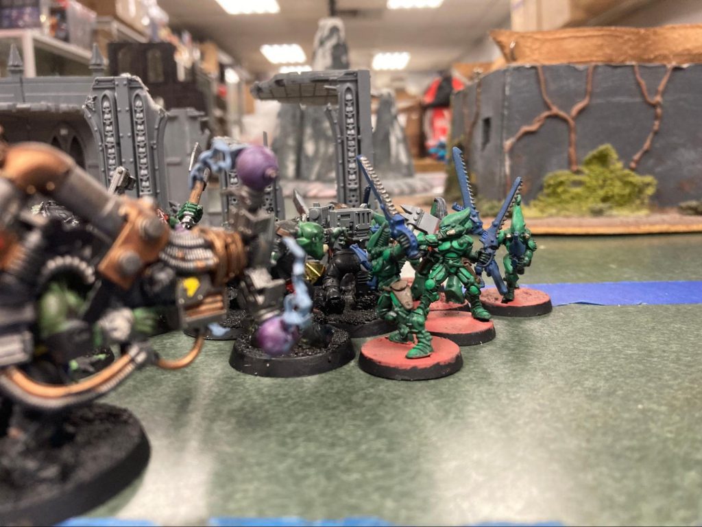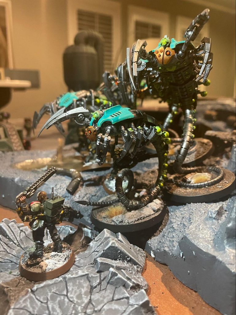 Pa’ul Tredes sends out his Striking Scorpions to finish off Boyz of the WAAGH! Mek Stompa on the Moon, Credit: PadraicMeanwhile, on the surface of Nox Veritas, Warboss Ankro puts out a call for battle at the Scrapyard. All fighting forces welcome to wreak havoc on the plains. Battles rage and the blood of many is spilled. Having earned his coin, Vykât Thuûrk heeds the call and makes his return to Nox Veritas after assisting the Imperium on Perplior. Content with the efforts being shown on the Moon, Xandu Patriarch of Rust of House Rusted Talon decides to return to the planet’s surface and spill more blood than many. Impressed, Ankro reluctantly bestows a gift to the corrupted knights.